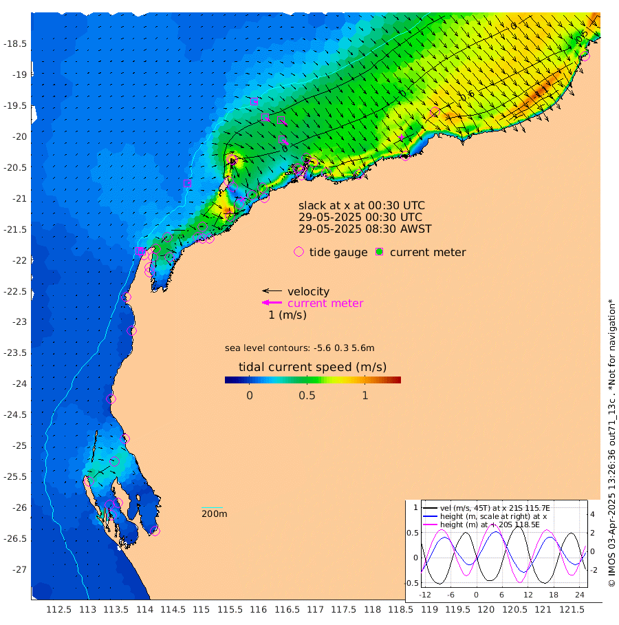 9cm/s 75T +12cm/s rms + 5cm/s -173T. NWSBAR 206m 12cm/s 40T +22cm/s rms + 10cm/s -148T. TAN100 109m 17cm/s 109T +11cm/s rms + 8cm/s -129T. PIL200 208m 32cm/s 128T +13cm/s rms + 7cm/s -137T. PIL100 105m 38cm/s 130T +12cm/s rms + 2cm/s -92T. PIL050 55m 12cm/s 48T +18cm/s rms + 4cm/s -149T. NRSNIN 61m 41cm/s 129T +6cm/s rms + 3cm/s 112T. NW Shelf M6 65m 28cm Withnell Point 14cm Denham 13cm Shark Bay (Inr Bn) 20cm Shark Bay 12cm Useless Loop -7cm Hamelin Pool 36cm Carnarvon 48cm Cape Cuvier 50cm Coral Bay 45cm Norwegian Bay 8cm Badjirrajirra 45cm Tantabiddi 25cm Point Murat 14cm Exmouth 5cm Learmonth 27cm Y Island 38cm North Muiron Island 37cm Roller 35cm Ashburton North 28cm Onslow (Beadon Creek) 35cm Thevenard Island -41cm Large Island -19cm North Sandy Island 15cm Barrow Island (Wapet Landing) -24cm Barrow Island (Tanker Mooring) 15cm Withnell Bay 7cm Trimouille Island 29cm North West Island -52cm Fortescue Road 8cm Steamboat Island -25cm Sholl Island 12cm Fairway Beacon 16cm Mawby Island 14cm Dampier (King Bay) 20cm Cape Legendre -14cm Hauy Island -6cm Port Walcott (Cape Lambert) -20cm Depuch Island -18cm Port Hedland 5cm Bedout Island -5cm Lagrange Bay