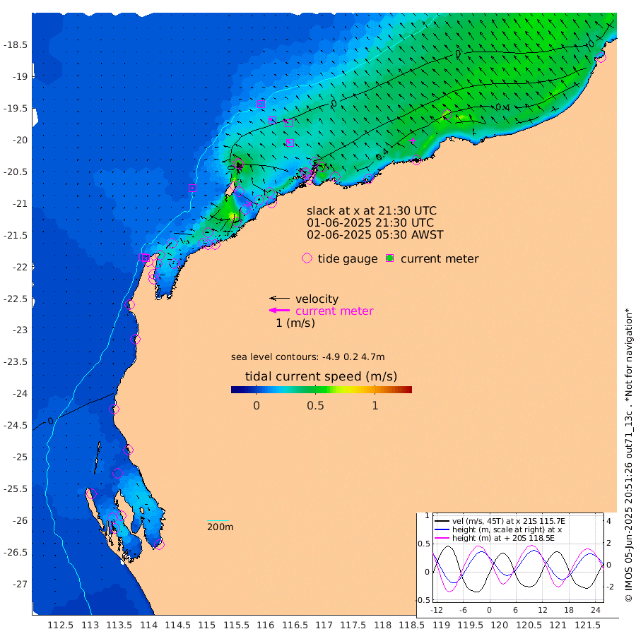 6cm/s -116T +12cm/s rms + 5cm/s -173T. NWSBAR 206m 3cm/s -141T +22cm/s rms + 10cm/s -148T. TAN100 109m 11cm/s -74T +11cm/s rms + 8cm/s -129T. PIL200 208m 17cm/s -52T +13cm/s rms + 7cm/s -137T. PIL100 105m 20cm/s -46T +12cm/s rms + 2cm/s -92T. PIL050 55m 2cm/s -122T +18cm/s rms + 4cm/s -149T. NRSNIN 61m 29cm/s -55T +6cm/s rms + 3cm/s 112T. NW Shelf M6 65m 8cm Withnell Point 7cm Denham 2cm Shark Bay (Inr Bn) 3cm Shark Bay -4cm Useless Loop -13cm Hamelin Pool 13cm Carnarvon 1cm Cape Cuvier -1cm Coral Bay 3cm Norwegian Bay 20cm Badjirrajirra 0cm Tantabiddi 11cm Point Murat 16cm Exmouth 16cm Learmonth 6cm Y Island 2cm North Muiron Island -1cm Roller 4cm Ashburton North 7cm Onslow (Beadon Creek) 4cm Thevenard Island 12cm Large Island 29cm North Sandy Island 12cm Barrow Island (Wapet Landing) 32cm Barrow Island (Tanker Mooring) 8cm Withnell Bay 17cm Trimouille Island 1cm North West Island 13cm Fortescue Road 15cm Steamboat Island 28cm Sholl Island 10cm Fairway Beacon 5cm Mawby Island 8cm Dampier (King Bay) 14cm Cape Legendre 20cm Hauy Island 15cm Port Walcott (Cape Lambert) 19cm Depuch Island 14cm Port Hedland -7cm Bedout Island -100cm Lagrange Bay