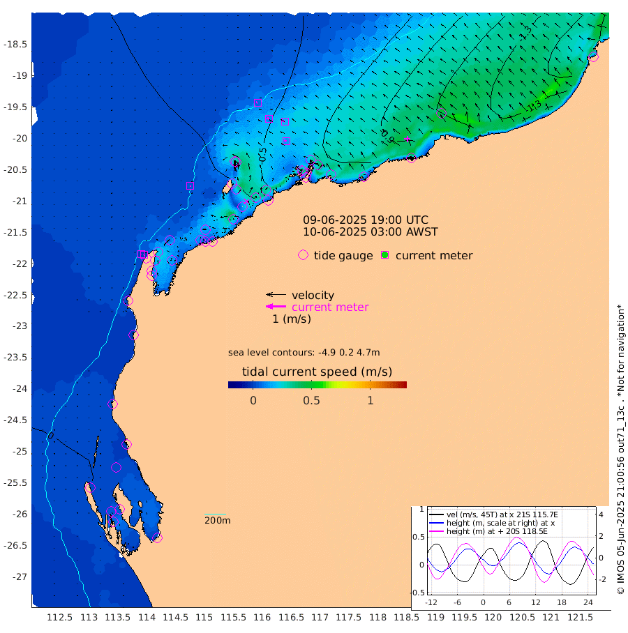 4cm/s -163T +12cm/s rms + 5cm/s -173T. NWSBAR 206m 1cm/s -125T +22cm/s rms + 10cm/s -148T. TAN100 109m 7cm/s -70T +11cm/s rms + 8cm/s -129T. PIL200 208m 11cm/s -57T +13cm/s rms + 7cm/s -137T. PIL100 105m 13cm/s -55T +12cm/s rms + 2cm/s -92T. PIL050 55m 1cm/s -128T +18cm/s rms + 4cm/s -149T. NRSNIN 61m 19cm/s -66T +6cm/s rms + 3cm/s 112T. NW Shelf M6 65m 2cm Withnell Point 0cm Denham -1cm Shark Bay (Inr Bn) -3cm Shark Bay -5cm Useless Loop -7cm Hamelin Pool -1cm Carnarvon -2cm Cape Cuvier -5cm Coral Bay -5cm Norwegian Bay -22cm Badjirrajirra -9cm Tantabiddi -15cm Point Murat -19cm Exmouth -22cm Learmonth -25cm Y Island -15cm North Muiron Island -24cm Roller -24cm Ashburton North -25cm Onslow (Beadon Creek) -25cm Thevenard Island -24cm Large Island -42cm North Sandy Island -37cm Barrow Island (Wapet Landing) -40cm Barrow Island (Tanker Mooring) -63cm Withnell Bay -21cm Trimouille Island -30cm North West Island -51cm Fortescue Road -49cm Steamboat Island -42cm Sholl Island -60cm Fairway Beacon -63cm Mawby Island -62cm Dampier (King Bay) -60cm Cape Legendre -64cm Hauy Island -78cm Port Walcott (Cape Lambert) -84cm Depuch Island -103cm Port Hedland -118cm Bedout Island -210cm Lagrange Bay