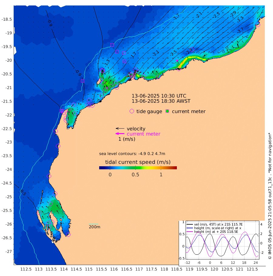 3cm/s 109T +12cm/s rms + 5cm/s -173T. NWSBAR 206m 6cm/s -143T +22cm/s rms + 10cm/s -148T. TAN100 109m 2cm/s -67T +11cm/s rms + 8cm/s -129T. PIL200 208m 4cm/s -95T +13cm/s rms + 7cm/s -137T. PIL100 105m 7cm/s -100T +12cm/s rms + 2cm/s -92T. PIL050 55m 6cm/s -143T +18cm/s rms + 4cm/s -149T. NRSNIN 61m 13cm/s -97T +6cm/s rms + 3cm/s 112T. NW Shelf M6 65m -50cm Withnell Point -32cm Denham -25cm Shark Bay (Inr Bn) -33cm Shark Bay -12cm Useless Loop 27cm Hamelin Pool -76cm Carnarvon -62cm Cape Cuvier -64cm Coral Bay -67cm Norwegian Bay -117cm Badjirrajirra -71cm Tantabiddi -94cm Point Murat -106cm Exmouth -114cm Learmonth -105cm Y Island -85cm North Muiron Island -97cm Roller -101cm Ashburton North -107cm Onslow (Beadon Creek) -104cm Thevenard Island -167cm Large Island -173cm North Sandy Island -134cm Barrow Island (Wapet Landing) -169cm Barrow Island (Tanker Mooring) -176cm Withnell Bay -127cm Trimouille Island -113cm North West Island -188cm Fortescue Road -179cm Steamboat Island -157cm Sholl Island -174cm Fairway Beacon -176cm Mawby Island -177cm Dampier (King Bay) -176cm Cape Legendre -190cm Hauy Island -212cm Port Walcott (Cape Lambert) -243cm Depuch Island -253cm Port Hedland -235cm Bedout Island -401cm Lagrange Bay