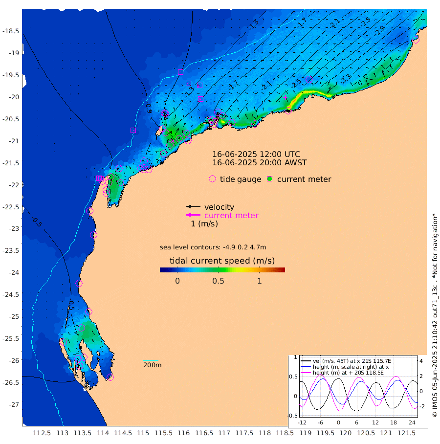 2cm/s 148T +12cm/s rms + 5cm/s -173T. NWSBAR 206m 6cm/s -143T +22cm/s rms + 10cm/s -148T. TAN100 109m 4cm/s -69T +11cm/s rms + 8cm/s -129T. PIL200 208m 6cm/s -71T +13cm/s rms + 7cm/s -137T. PIL100 105m 8cm/s -81T +12cm/s rms + 2cm/s -92T. PIL050 55m 6cm/s -140T +18cm/s rms + 4cm/s -149T. NRSNIN 61m 10cm/s -109T +6cm/s rms + 3cm/s 112T. NW Shelf M6 65m -38cm Withnell Point -20cm Denham -15cm Shark Bay (Inr Bn) -22cm Shark Bay -4cm Useless Loop 21cm Hamelin Pool -63cm Carnarvon -52cm Cape Cuvier -54cm Coral Bay -57cm Norwegian Bay -103cm Badjirrajirra -61cm Tantabiddi -81cm Point Murat -92cm Exmouth -97cm Learmonth -92cm Y Island -73cm North Muiron Island -83cm Roller -88cm Ashburton North -94cm Onslow (Beadon Creek) -91cm Thevenard Island -127cm Large Island -150cm North Sandy Island -118cm Barrow Island (Wapet Landing) -146cm Barrow Island (Tanker Mooring) -158cm Withnell Bay -107cm Trimouille Island -96cm North West Island -148cm Fortescue Road -158cm Steamboat Island -146cm Sholl Island -157cm Fairway Beacon -160cm Mawby Island -159cm Dampier (King Bay) -161cm Cape Legendre -168cm Hauy Island -190cm Port Walcott (Cape Lambert) -207cm Depuch Island -229cm Port Hedland -222cm Bedout Island -307cm Lagrange Bay