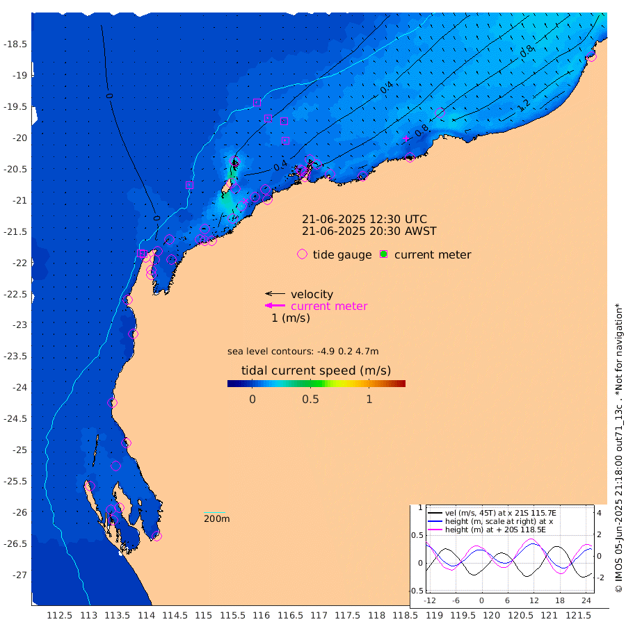 6cm/s -72T +12cm/s rms + 5cm/s -173T. NWSBAR 206m 2cm/s -152T +22cm/s rms + 10cm/s -148T. TAN100 109m 4cm/s -64T +11cm/s rms + 8cm/s -129T. PIL200 208m 7cm/s -43T +13cm/s rms + 7cm/s -137T. PIL100 105m 8cm/s -43T +12cm/s rms + 2cm/s -92T. PIL050 55m 2cm/s -127T +18cm/s rms + 4cm/s -149T. NRSNIN 61m 5cm/s -41T +6cm/s rms + 3cm/s 112T. NW Shelf M6 65m -5cm Withnell Point -15cm Denham -16cm Shark Bay (Inr Bn) -15cm Shark Bay -24cm Useless Loop -13cm Hamelin Pool 1cm Carnarvon -4cm Cape Cuvier -5cm Coral Bay -2cm Norwegian Bay 20cm Badjirrajirra -1cm Tantabiddi 9cm Point Murat 15cm Exmouth 25cm Learmonth 10cm Y Island 3cm North Muiron Island 10cm Roller 10cm Ashburton North 13cm Onslow (Beadon Creek) 11cm Thevenard Island 23cm Large Island 48cm North Sandy Island 26cm Barrow Island (Wapet Landing) 44cm Barrow Island (Tanker Mooring) 40cm Withnell Bay 24cm Trimouille Island 18cm North West Island 33cm Fortescue Road 36cm Steamboat Island 46cm Sholl Island 40cm Fairway Beacon 42cm Mawby Island 40cm Dampier (King Bay) 44cm Cape Legendre 57cm Hauy Island 57cm Port Walcott (Cape Lambert) 69cm Depuch Island 73cm Port Hedland 50cm Bedout Island 90cm Lagrange Bay