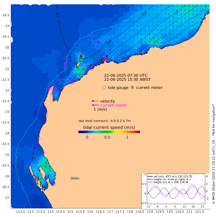 7cm/s 83T +12cm/s rms + 5cm/s -173T. NWSBAR 206m 1cm/s -152T +22cm/s rms + 10cm/s -148T. TAN100 109m 6cm/s 113T +11cm/s rms + 8cm/s -129T. PIL200 208m 9cm/s 147T +13cm/s rms + 7cm/s -137T. PIL100 105m 10cm/s 160T +12cm/s rms + 2cm/s -92T. PIL050 55m 1cm/s -177T +18cm/s rms + 4cm/s -149T. NRSNIN 61m 5cm/s -156T +6cm/s rms + 3cm/s 112T. NW Shelf M6 65m -43cm Withnell Point -34cm Denham -29cm Shark Bay (Inr Bn) -31cm Shark Bay -19cm Useless Loop 20cm Hamelin Pool -54cm Carnarvon -39cm Cape Cuvier -39cm Coral Bay -42cm Norwegian Bay -73cm Badjirrajirra -43cm Tantabiddi -58cm Point Murat -67cm Exmouth -75cm Learmonth -60cm Y Island -50cm North Muiron Island -57cm Roller -58cm Ashburton North -64cm Onslow (Beadon Creek) -60cm Thevenard Island -80cm Large Island -105cm North Sandy Island -79cm Barrow Island (Wapet Landing) -104cm Barrow Island (Tanker Mooring) -97cm Withnell Bay -80cm Trimouille Island -66cm North West Island -86cm Fortescue Road -98cm Steamboat Island -84cm Sholl Island -96cm Fairway Beacon -97cm Mawby Island -97cm Dampier (King Bay) -105cm Cape Legendre -109cm Hauy Island -117cm Port Walcott (Cape Lambert) -141cm Depuch Island -136cm Port Hedland -103cm Bedout Island -175cm Lagrange Bay