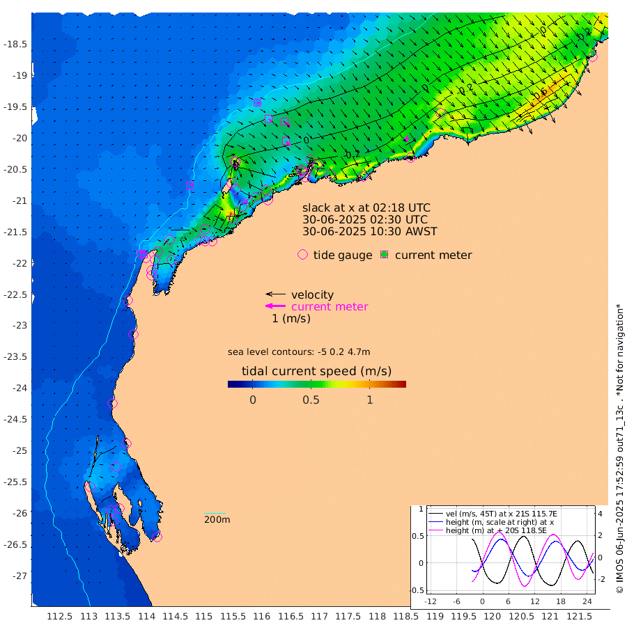 8cm/s 75T +12cm/s rms + 5cm/s -173T. NWSBAR 206m 9cm/s 39T +22cm/s rms + 10cm/s -148T. TAN100 109m 14cm/s 113T +11cm/s rms + 8cm/s -129T. PIL200 208m 24cm/s 131T +13cm/s rms + 7cm/s -137T. PIL100 105m 30cm/s 133T +12cm/s rms + 2cm/s -92T. PIL050 55m 9cm/s 47T +18cm/s rms + 4cm/s -149T. NRSNIN 61m 38cm/s 129T +6cm/s rms + 3cm/s 112T. NW Shelf M6 65m 9cm Withnell Point 2cm Denham 2cm Shark Bay (Inr Bn) 10cm Shark Bay 7cm Useless Loop 3cm Hamelin Pool 12cm Carnarvon 24cm Cape Cuvier 26cm Coral Bay 21cm Norwegian Bay -8cm Badjirrajirra 23cm Tantabiddi 6cm Point Murat -3cm Exmouth -15cm Learmonth 11cm Y Island 18cm North Muiron Island 19cm Roller 15cm Ashburton North 9cm Onslow (Beadon Creek) 15cm Thevenard Island -13cm Large Island -27cm North Sandy Island -2cm Barrow Island (Wapet Landing) -30cm Barrow Island (Tanker Mooring) -1cm Withnell Bay -8cm Trimouille Island 10cm North West Island -13cm Fortescue Road -3cm Steamboat Island -36cm Sholl Island -3cm Fairway Beacon -1cm Mawby Island -1cm Dampier (King Bay) -4cm Cape Legendre -21cm Hauy Island -16cm Port Walcott (Cape Lambert) -21cm Depuch Island -24cm Port Hedland 13cm Bedout Island 99cm Lagrange Bay