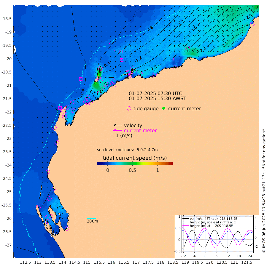 5cm/s -61T +12cm/s rms + 5cm/s -173T. NWSBAR 206m 5cm/s -143T +22cm/s rms + 10cm/s -148T. TAN100 109m 4cm/s -60T +11cm/s rms + 8cm/s -129T. PIL200 208m 9cm/s -41T +13cm/s rms + 7cm/s -137T. PIL100 105m 11cm/s -32T +12cm/s rms + 2cm/s -92T. PIL050 55m 5cm/s -134T +18cm/s rms + 4cm/s -149T. NRSNIN 61m 21cm/s -46T +6cm/s rms + 3cm/s 112T. NW Shelf M6 65m 18cm Withnell Point 19cm Denham 18cm Shark Bay (Inr Bn) 21cm Shark Bay 13cm Useless Loop -6cm Hamelin Pool 26cm Carnarvon 14cm Cape Cuvier 16cm Coral Bay 18cm Norwegian Bay 69cm Badjirrajirra 23cm Tantabiddi 46cm Point Murat 59cm Exmouth 69cm Learmonth 52cm Y Island 34cm North Muiron Island 41cm Roller 47cm Ashburton North 54cm Onslow (Beadon Creek) 50cm Thevenard Island 105cm Large Island 111cm North Sandy Island 78cm Barrow Island (Wapet Landing) 111cm Barrow Island (Tanker Mooring) 106cm Withnell Bay 73cm Trimouille Island 58cm North West Island 116cm Fortescue Road 98cm Steamboat Island 124cm Sholl Island 104cm Fairway Beacon 103cm Mawby Island 107cm Dampier (King Bay) 102cm Cape Legendre 122cm Hauy Island 138cm Port Walcott (Cape Lambert) 140cm Depuch Island 170cm Port Hedland 160cm Bedout Island 157cm Lagrange Bay