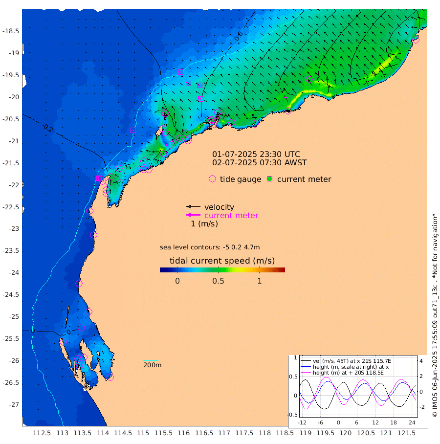 5cm/s -144T +12cm/s rms + 5cm/s -173T. NWSBAR 206m 4cm/s -137T +22cm/s rms + 10cm/s -148T. TAN100 109m 12cm/s -75T +11cm/s rms + 8cm/s -129T. PIL200 208m 17cm/s -56T +13cm/s rms + 7cm/s -137T. PIL100 105m 20cm/s -54T +12cm/s rms + 2cm/s -92T. PIL050 55m 4cm/s -128T +18cm/s rms + 4cm/s -149T. NRSNIN 61m 17cm/s -61T +6cm/s rms + 3cm/s 112T. NW Shelf M6 65m 8cm Withnell Point 20cm Denham 16cm Shark Bay (Inr Bn) 19cm Shark Bay 21cm Useless Loop 2cm Hamelin Pool -2cm Carnarvon -9cm Cape Cuvier -12cm Coral Bay -13cm Norwegian Bay -21cm Badjirrajirra -16cm Tantabiddi -16cm Point Murat -18cm Exmouth -28cm Learmonth -26cm Y Island -20cm North Muiron Island -27cm Roller -27cm Ashburton North -27cm Onslow (Beadon Creek) -28cm Thevenard Island -69cm Large Island -42cm North Sandy Island -37cm Barrow Island (Wapet Landing) -36cm Barrow Island (Tanker Mooring) -63cm Withnell Bay -37cm Trimouille Island -32cm North West Island -78cm Fortescue Road -49cm Steamboat Island -54cm Sholl Island -60cm Fairway Beacon -65cm Mawby Island -64cm Dampier (King Bay) -58cm Cape Legendre -61cm Hauy Island -76cm Port Walcott (Cape Lambert) -81cm Depuch Island -101cm Port Hedland -106cm Bedout Island -236cm Lagrange Bay