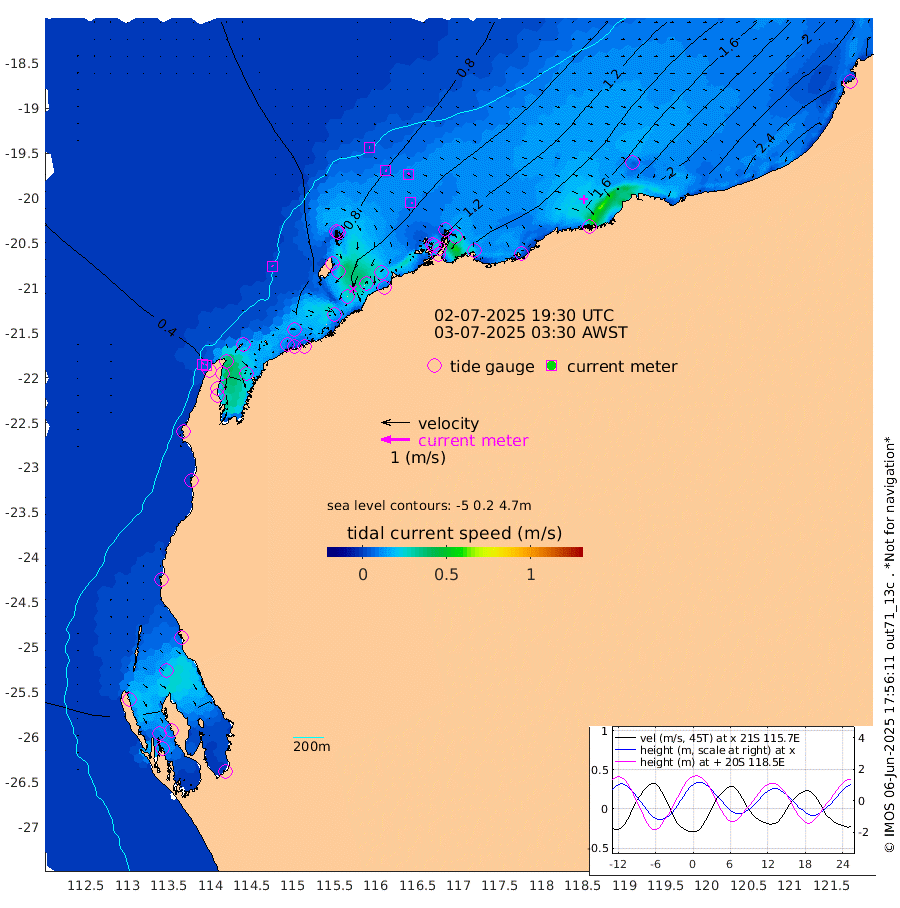 2cm/s -48T +12cm/s rms + 5cm/s -173T. NWSBAR 206m 4cm/s 38T +22cm/s rms + 10cm/s -148T. TAN100 109m 3cm/s 88T +11cm/s rms + 8cm/s -129T. PIL200 208m 6cm/s 95T +13cm/s rms + 7cm/s -137T. PIL100 105m 8cm/s 91T +12cm/s rms + 2cm/s -92T. PIL050 55m 4cm/s 44T +18cm/s rms + 4cm/s -149T. NRSNIN 61m 6cm/s 37T +6cm/s rms + 3cm/s 112T. NW Shelf M6 65m 21cm Withnell Point 10cm Denham 8cm Shark Bay (Inr Bn) 6cm Shark Bay -1cm Useless Loop -15cm Hamelin Pool 40cm Carnarvon 34cm Cape Cuvier 36cm Coral Bay 40cm Norwegian Bay 70cm Badjirrajirra 40cm Tantabiddi 54cm Point Murat 62cm Exmouth 73cm Learmonth 62cm Y Island 50cm North Muiron Island 55cm Roller 61cm Ashburton North 64cm Onslow (Beadon Creek) 62cm Thevenard Island 96cm Large Island 103cm North Sandy Island 82cm Barrow Island (Wapet Landing) 98cm Barrow Island (Tanker Mooring) 111cm Withnell Bay 78cm Trimouille Island 64cm North West Island 111cm Fortescue Road 101cm Steamboat Island 108cm Sholl Island 108cm Fairway Beacon 111cm Mawby Island 111cm Dampier (King Bay) 112cm Cape Legendre 114cm Hauy Island 134cm Port Walcott (Cape Lambert) 142cm Depuch Island 163cm Port Hedland 147cm Bedout Island 201cm Lagrange Bay