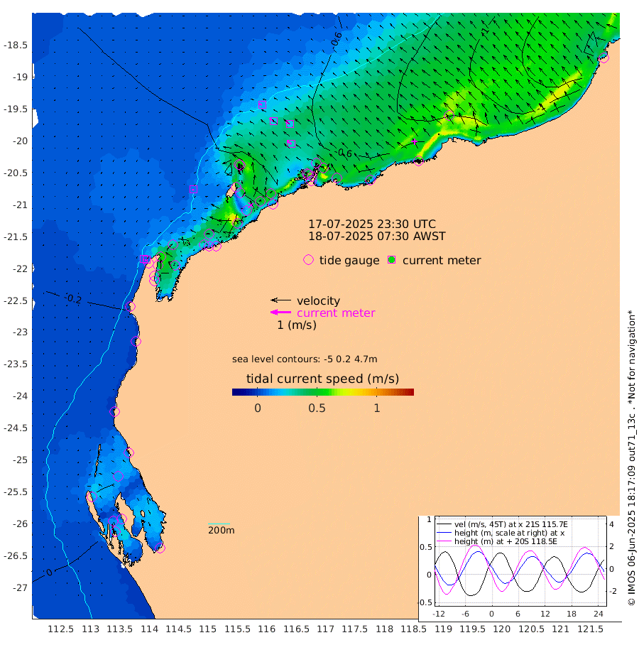 8cm/s -128T +12cm/s rms + 5cm/s -173T. NWSBAR 206m 7cm/s -137T +22cm/s rms + 10cm/s -148T. TAN100 109m 16cm/s -75T +11cm/s rms + 8cm/s -129T. PIL200 208m 24cm/s -55T +13cm/s rms + 7cm/s -137T. PIL100 105m 28cm/s -52T +12cm/s rms + 2cm/s -92T. PIL050 55m 7cm/s -130T +18cm/s rms + 4cm/s -149T. NRSNIN 61m 23cm/s -58T +6cm/s rms + 3cm/s 112T. NW Shelf M6 65m 8cm Withnell Point 28cm Denham 25cm Shark Bay (Inr Bn) 26cm Shark Bay 31cm Useless Loop 7cm Hamelin Pool -6cm Carnarvon -18cm Cape Cuvier -20cm Coral Bay -19cm Norwegian Bay -20cm Badjirrajirra -22cm Tantabiddi -18cm Point Murat -18cm Exmouth -26cm Learmonth -25cm Y Island -24cm North Muiron Island -28cm Roller -31cm Ashburton North -30cm Onslow (Beadon Creek) -32cm Thevenard Island -25cm Large Island -31cm North Sandy Island -36cm Barrow Island (Wapet Landing) -25cm Barrow Island (Tanker Mooring) -63cm Withnell Bay -34cm Trimouille Island -38cm North West Island -24cm Fortescue Road -60cm Steamboat Island -51cm Sholl Island -60cm Fairway Beacon -67cm Mawby Island -63cm Dampier (King Bay) -63cm Cape Legendre -57cm Hauy Island -71cm Port Walcott (Cape Lambert) -69cm Depuch Island -93cm Port Hedland -98cm Bedout Island -130cm Lagrange Bay