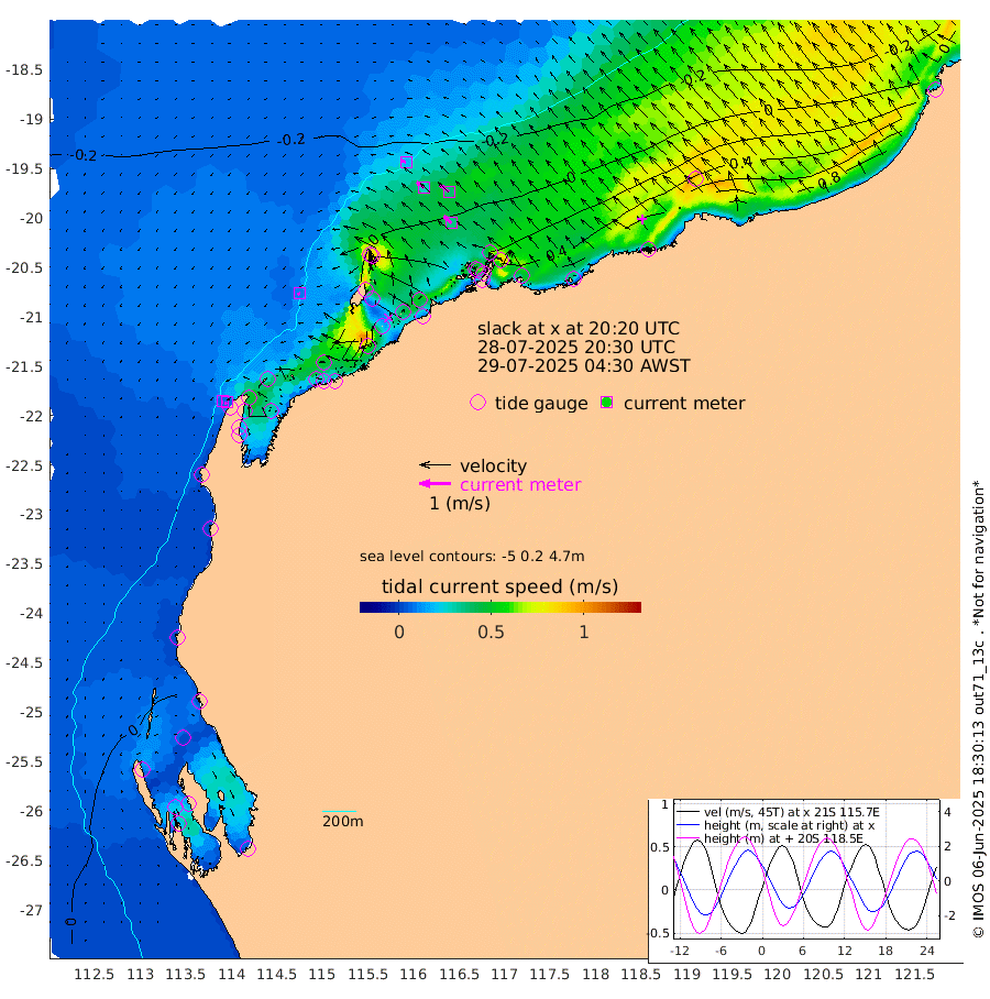 10cm/s -121T +12cm/s rms + 5cm/s -173T. NWSBAR 206m 7cm/s -138T +22cm/s rms + 10cm/s -148T. TAN100 109m 19cm/s -73T +11cm/s rms + 8cm/s -129T. PIL200 208m 29cm/s -52T +13cm/s rms + 7cm/s -137T. PIL100 105m 35cm/s -48T +12cm/s rms + 2cm/s -92T. PIL050 55m 7cm/s -128T +18cm/s rms + 4cm/s -149T. NRSNIN 61m 37cm/s -52T +6cm/s rms + 3cm/s 112T. NW Shelf M6 65m 12cm Withnell Point 24cm Denham 18cm Shark Bay (Inr Bn) 19cm Shark Bay 17cm Useless Loop -7cm Hamelin Pool 12cm Carnarvon -5cm Cape Cuvier -8cm Coral Bay -4cm Norwegian Bay 26cm Badjirrajirra -6cm Tantabiddi 12cm Point Murat 20cm Exmouth 22cm Learmonth 6cm Y Island -2cm North Muiron Island -4cm Roller 0cm Ashburton North 6cm Onslow (Beadon Creek) -1cm Thevenard Island 12cm Large Island 41cm North Sandy Island 13cm Barrow Island (Wapet Landing) 45cm Barrow Island (Tanker Mooring) 4cm Withnell Bay 16cm Trimouille Island 2cm North West Island 8cm Fortescue Road 19cm Steamboat Island 39cm Sholl Island 7cm Fairway Beacon 3cm Mawby Island 5cm Dampier (King Bay) 7cm Cape Legendre 23cm Hauy Island 16cm Port Walcott (Cape Lambert) 21cm Depuch Island 15cm Port Hedland -13cm Bedout Island -150cm Lagrange Bay