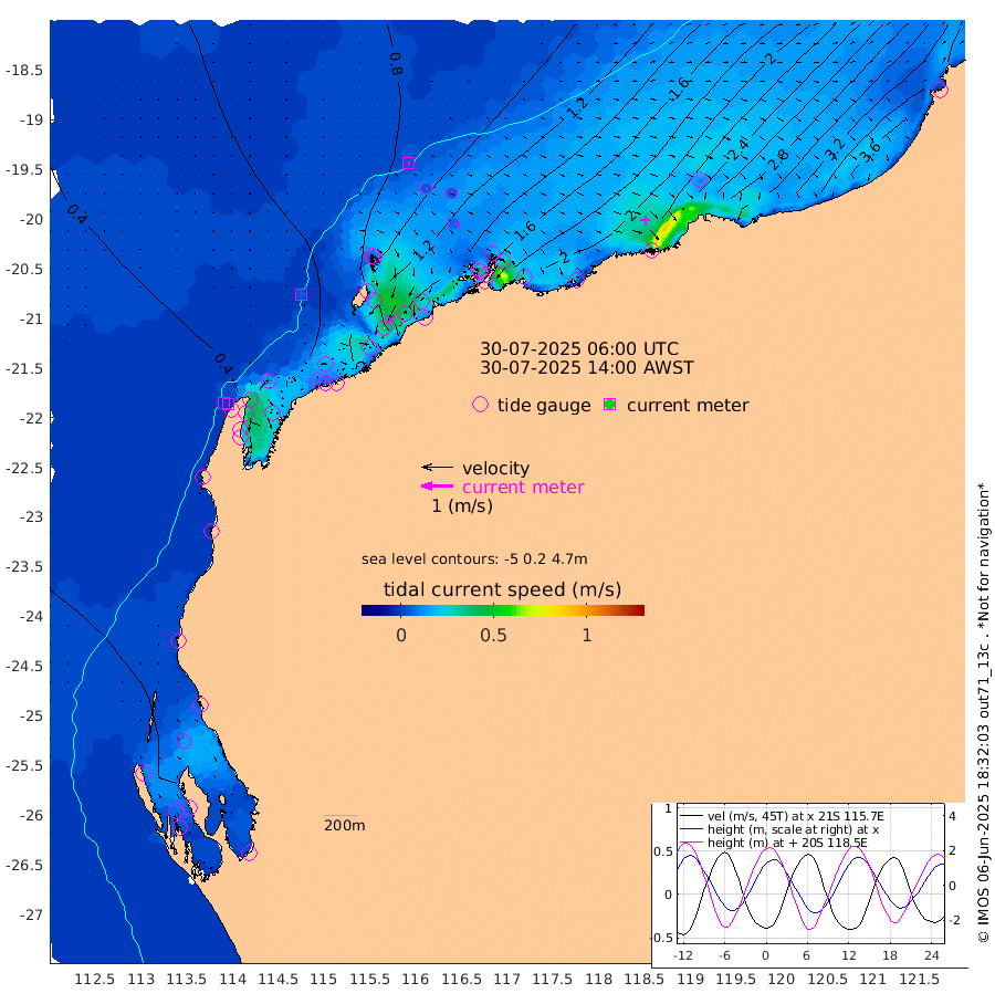 4cm/s -6T +12cm/s rms + 5cm/s -173T. NWSBAR 206m 1cm/s 64T +22cm/s rms + 10cm/s -148T. TAN100 109m 5cm/s 96T +11cm/s rms + 8cm/s -129T. PIL200 208m 5cm/s 106T +13cm/s rms + 7cm/s -137T. PIL100 105m 6cm/s 98T +12cm/s rms + 2cm/s -92T. PIL050 55m 1cm/s 57T +18cm/s rms + 4cm/s -149T. NRSNIN 61m 4cm/s 36T +6cm/s rms + 3cm/s 112T. NW Shelf M6 65m 14cm Withnell Point 5cm Denham 4cm Shark Bay (Inr Bn) 9cm Shark Bay -1cm Useless Loop -8cm Hamelin Pool 29cm Carnarvon 23cm Cape Cuvier 27cm Coral Bay 28cm Norwegian Bay 77cm Badjirrajirra 35cm Tantabiddi 56cm Point Murat 68cm Exmouth 78cm Learmonth 68cm Y Island 49cm North Muiron Island 60cm Roller 65cm Ashburton North 70cm Onslow (Beadon Creek) 68cm Thevenard Island 116cm Large Island 129cm North Sandy Island 98cm Barrow Island (Wapet Landing) 125cm Barrow Island (Tanker Mooring) 142cm Withnell Bay 92cm Trimouille Island 78cm North West Island 135cm Fortescue Road 136cm Steamboat Island 144cm Sholl Island 139cm Fairway Beacon 140cm Mawby Island 143cm Dampier (King Bay) 134cm Cape Legendre 155cm Hauy Island 179cm Port Walcott (Cape Lambert) 194cm Depuch Island 225cm Port Hedland 228cm Bedout Island 283cm Lagrange Bay