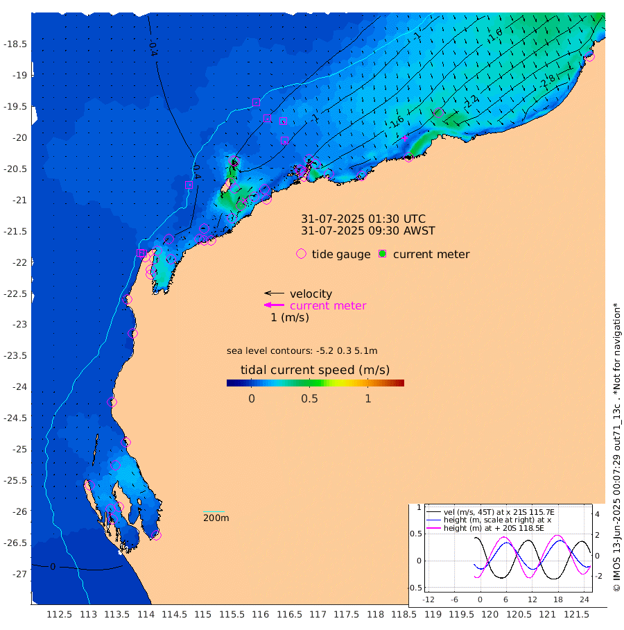 6cm/s 103T +12cm/s rms + 5cm/s -173T. NWSBAR 206m 2cm/s 33T +22cm/s rms + 10cm/s -148T. TAN100 109m 4cm/s 125T +11cm/s rms + 8cm/s -129T. PIL200 208m 7cm/s 151T +13cm/s rms + 7cm/s -137T. PIL100 105m 10cm/s 156T +12cm/s rms + 2cm/s -92T. PIL050 55m 2cm/s 48T +18cm/s rms + 4cm/s -149T. NRSNIN 61m 14cm/s 138T +6cm/s rms + 3cm/s 112T. NW Shelf M6 65m -14cm Withnell Point -3cm Denham -3cm Shark Bay (Inr Bn) -1cm Shark Bay 10cm Useless Loop 17cm Hamelin Pool -29cm Carnarvon -19cm Cape Cuvier -20cm Coral Bay -25cm Norwegian Bay -71cm Badjirrajirra -27cm Tantabiddi -49cm Point Murat -62cm Exmouth -80cm Learmonth -55cm Y Island -38cm North Muiron Island -48cm Roller -52cm Ashburton North -58cm Onslow (Beadon Creek) -54cm Thevenard Island -113cm Large Island -123cm North Sandy Island -84cm Barrow Island (Wapet Landing) -117cm Barrow Island (Tanker Mooring) -114cm Withnell Bay -89cm Trimouille Island -60cm North West Island -122cm Fortescue Road -103cm Steamboat Island -134cm Sholl Island -112cm Fairway Beacon -113cm Mawby Island -115cm Dampier (King Bay) -113cm Cape Legendre -130cm Hauy Island -148cm Port Walcott (Cape Lambert) -157cm Depuch Island -183cm Port Hedland -154cm Bedout Island -187cm Lagrange Bay