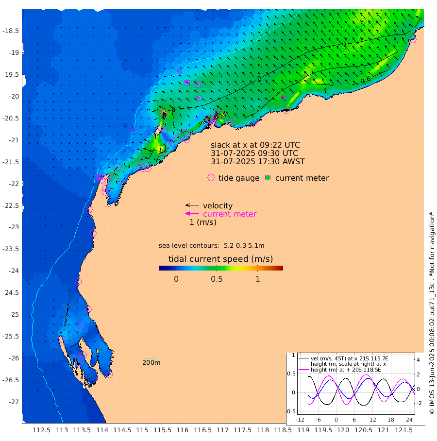 8cm/s -96T +12cm/s rms + 5cm/s -173T. NWSBAR 206m 9cm/s -143T +22cm/s rms + 10cm/s -148T. TAN100 109m 13cm/s -70T +11cm/s rms + 8cm/s -129T. PIL200 208m 23cm/s -52T +13cm/s rms + 7cm/s -137T. PIL100 105m 28cm/s -50T +12cm/s rms + 2cm/s -92T. PIL050 55m 9cm/s -134T +18cm/s rms + 4cm/s -149T. NRSNIN 61m 30cm/s -59T +6cm/s rms + 3cm/s 112T. NW Shelf M6 65m -6cm Withnell Point -1cm Denham -3cm Shark Bay (Inr Bn) -2cm Shark Bay -5cm Useless Loop -4cm Hamelin Pool -10cm Carnarvon -20cm Cape Cuvier -22cm Coral Bay -18cm Norwegian Bay 4cm Badjirrajirra -20cm Tantabiddi -6cm Point Murat 1cm Exmouth 7cm Learmonth -11cm Y Island -17cm North Muiron Island -16cm Roller -15cm Ashburton North -11cm Onslow (Beadon Creek) -14cm Thevenard Island 15cm Large Island 19cm North Sandy Island -2cm Barrow Island (Wapet Landing) 23cm Barrow Island (Tanker Mooring) -9cm Withnell Bay 4cm Trimouille Island -12cm North West Island 12cm Fortescue Road -9cm Steamboat Island 29cm Sholl Island -8cm Fairway Beacon -12cm Mawby Island -8cm Dampier (King Bay) -10cm Cape Legendre 9cm Hauy Island 2cm Port Walcott (Cape Lambert) -4cm Depuch Island 2cm Port Hedland -22cm Bedout Island -82cm Lagrange Bay