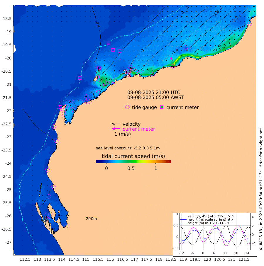3cm/s 157T +12cm/s rms + 5cm/s -173T. NWSBAR 206m 1cm/s 27T +22cm/s rms + 10cm/s -148T. TAN100 109m 4cm/s -66T +11cm/s rms + 8cm/s -129T. PIL200 208m 5cm/s -63T +13cm/s rms + 7cm/s -137T. PIL100 105m 7cm/s -76T +12cm/s rms + 2cm/s -92T. PIL050 55m 0cm/s 24T +18cm/s rms + 4cm/s -149T. NRSNIN 61m 4cm/s -102T +6cm/s rms + 3cm/s 112T. NW Shelf M6 65m 5cm Withnell Point 9cm Denham 6cm Shark Bay (Inr Bn) 9cm Shark Bay 9cm Useless Loop -1cm Hamelin Pool 1cm Carnarvon 5cm Cape Cuvier 2cm Coral Bay -1cm Norwegian Bay -32cm Badjirrajirra -5cm Tantabiddi -18cm Point Murat -27cm Exmouth -39cm Learmonth -28cm Y Island -15cm North Muiron Island -24cm Roller -27cm Ashburton North -31cm Onslow (Beadon Creek) -29cm Thevenard Island -86cm Large Island -72cm North Sandy Island -50cm Barrow Island (Wapet Landing) -70cm Barrow Island (Tanker Mooring) -85cm Withnell Bay -51cm Trimouille Island -35cm North West Island -113cm Fortescue Road -69cm Steamboat Island -70cm Sholl Island -83cm Fairway Beacon -83cm Mawby Island -85cm Dampier (King Bay) -81cm Cape Legendre -96cm Hauy Island -112cm Port Walcott (Cape Lambert) -135cm Depuch Island -148cm Port Hedland -149cm Bedout Island -304cm Lagrange Bay