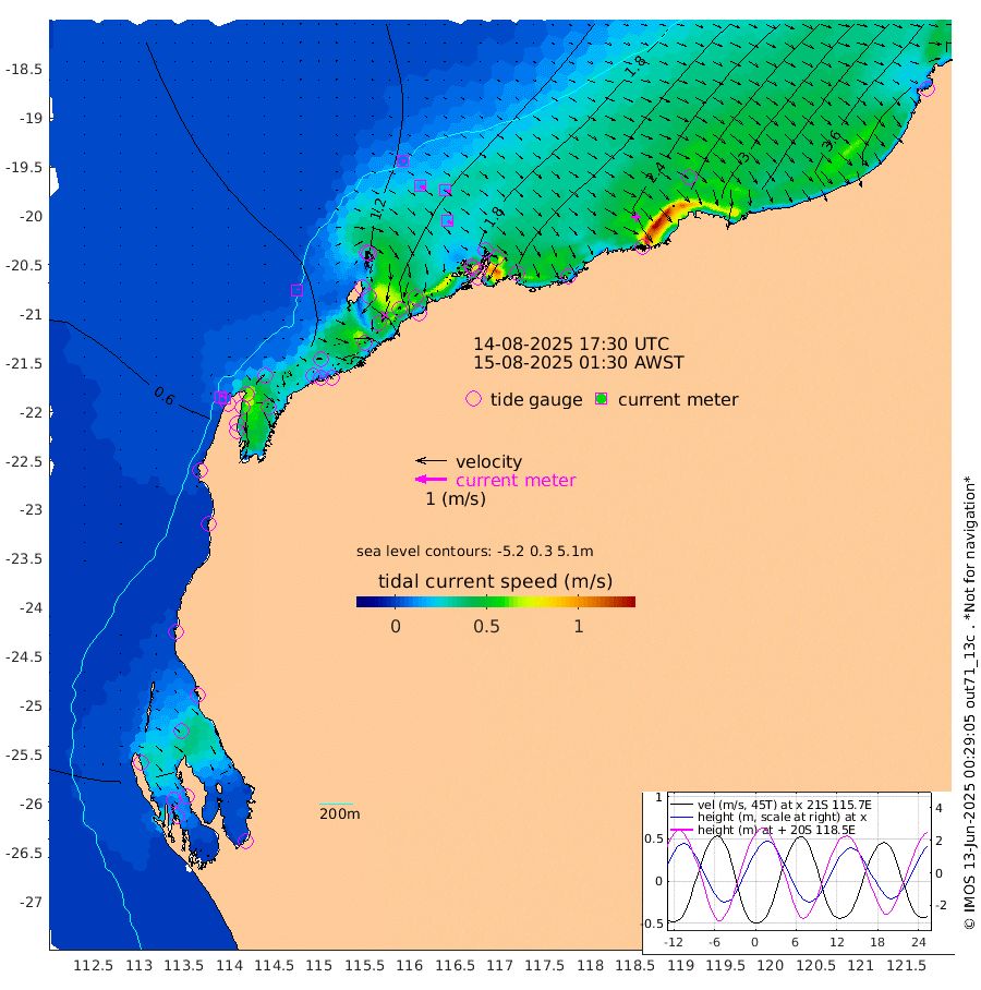 4cm/s 14T +12cm/s rms + 5cm/s -173T. NWSBAR 206m 7cm/s 40T +22cm/s rms + 10cm/s -148T. TAN100 109m 10cm/s 103T +11cm/s rms + 8cm/s -129T. PIL200 208m 17cm/s 113T +13cm/s rms + 7cm/s -137T. PIL100 105m 20cm/s 113T +12cm/s rms + 2cm/s -92T. PIL050 55m 7cm/s 44T +18cm/s rms + 4cm/s -149T. NRSNIN 61m 19cm/s 105T +6cm/s rms + 3cm/s 112T. NW Shelf M6 65m 33cm Withnell Point 16cm Denham 16cm Shark Bay (Inr Bn) 15cm Shark Bay 5cm Useless Loop -16cm Hamelin Pool 58cm Carnarvon 53cm Cape Cuvier 57cm Coral Bay 60cm Norwegian Bay 106cm Badjirrajirra 65cm Tantabiddi 83cm Point Murat 95cm Exmouth 108cm Learmonth 97cm Y Island 79cm North Muiron Island 90cm Roller 97cm Ashburton North 104cm Onslow (Beadon Creek) 100cm Thevenard Island 117cm Large Island 157cm North Sandy Island 131cm Barrow Island (Wapet Landing) 150cm Barrow Island (Tanker Mooring) 186cm Withnell Bay 131cm Trimouille Island 109cm North West Island 131cm Fortescue Road 183cm Steamboat Island 168cm Sholl Island 181cm Fairway Beacon 184cm Mawby Island 185cm Dampier (King Bay) 190cm Cape Legendre 191cm Hauy Island 223cm Port Walcott (Cape Lambert) 242cm Depuch Island 274cm Port Hedland 270cm Bedout Island 311cm Lagrange Bay