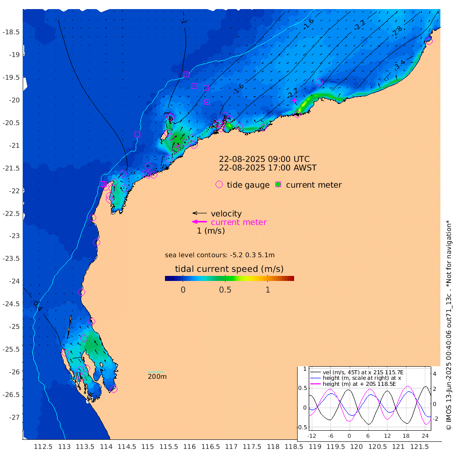 2cm/s 134T +12cm/s rms + 5cm/s -173T. NWSBAR 206m 5cm/s -140T +22cm/s rms + 10cm/s -148T. TAN100 109m 2cm/s -49T +11cm/s rms + 8cm/s -129T. PIL200 208m 4cm/s -85T +13cm/s rms + 7cm/s -137T. PIL100 105m 7cm/s -89T +12cm/s rms + 2cm/s -92T. PIL050 55m 5cm/s -144T +18cm/s rms + 4cm/s -149T. NRSNIN 61m 4cm/s -158T +6cm/s rms + 3cm/s 112T. NW Shelf M6 65m -41cm Withnell Point -29cm Denham -24cm Shark Bay (Inr Bn) -31cm Shark Bay -13cm Useless Loop 21cm Hamelin Pool -63cm Carnarvon -50cm Cape Cuvier -52cm Coral Bay -52cm Norwegian Bay -99cm Badjirrajirra -59cm Tantabiddi -79cm Point Murat -89cm Exmouth -97cm Learmonth -84cm Y Island -69cm North Muiron Island -77cm Roller -86cm Ashburton North -92cm Onslow (Beadon Creek) -89cm Thevenard Island -125cm Large Island -149cm North Sandy Island -117cm Barrow Island (Wapet Landing) -145cm Barrow Island (Tanker Mooring) -157cm Withnell Bay -113cm Trimouille Island -97cm North West Island -140cm Fortescue Road -152cm Steamboat Island -138cm Sholl Island -154cm Fairway Beacon -155cm Mawby Island -158cm Dampier (King Bay) -162cm Cape Legendre -168cm Hauy Island -191cm Port Walcott (Cape Lambert) -210cm Depuch Island -229cm Port Hedland -223cm Bedout Island -268cm Lagrange Bay