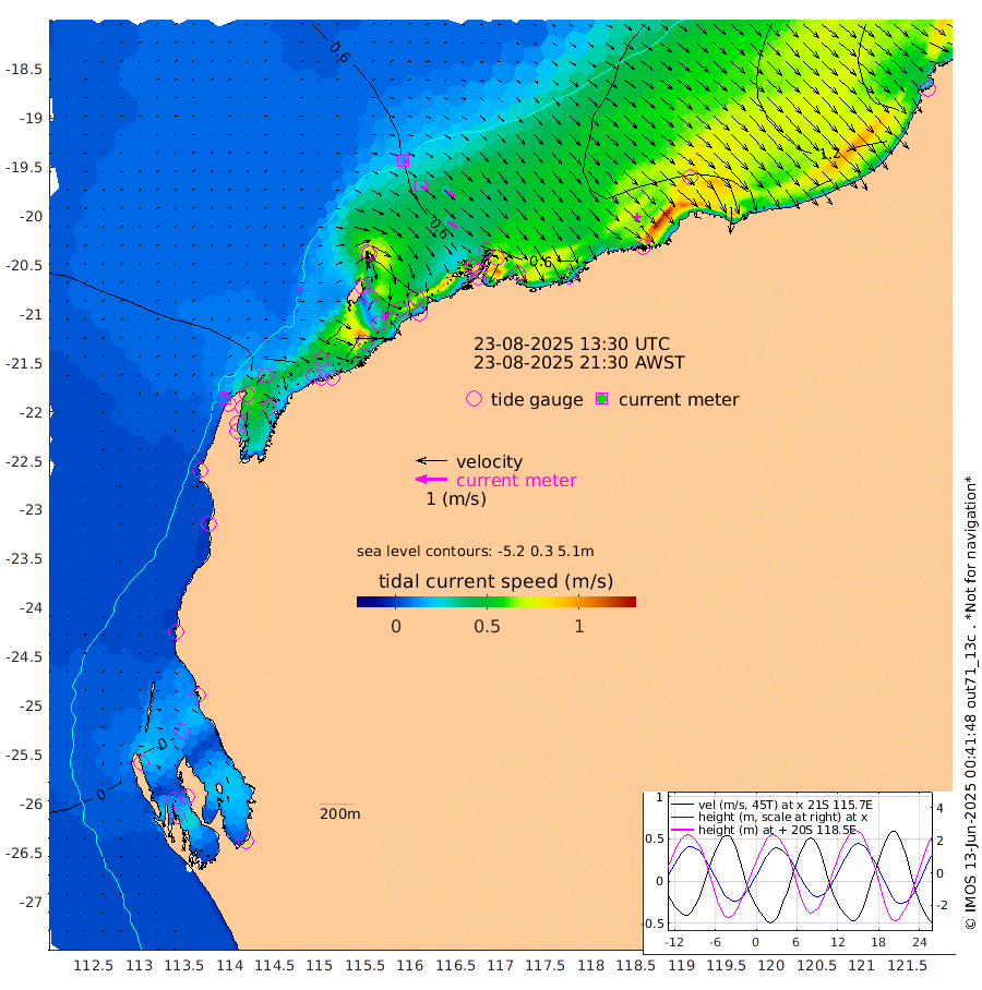8cm/s 51T +12cm/s rms + 5cm/s -173T. NWSBAR 206m 10cm/s 45T +22cm/s rms + 10cm/s -148T. TAN100 109m 17cm/s 110T +11cm/s rms + 8cm/s -129T. PIL200 208m 30cm/s 125T +13cm/s rms + 7cm/s -137T. PIL100 105m 35cm/s 128T +12cm/s rms + 2cm/s -92T. PIL050 55m 10cm/s 48T +18cm/s rms + 4cm/s -149T. NRSNIN 61m 35cm/s 122T +6cm/s rms + 3cm/s 112T. NW Shelf M6 65m -11cm Withnell Point -34cm Denham -32cm Shark Bay (Inr Bn) -33cm Shark Bay -37cm Useless Loop -8cm Hamelin Pool 4cm Carnarvon 15cm Cape Cuvier 18cm Coral Bay 21cm Norwegian Bay 14cm Badjirrajirra 20cm Tantabiddi 15cm Point Murat 13cm Exmouth 19cm Learmonth 23cm Y Island 22cm North Muiron Island 26cm Roller 31cm Ashburton North 29cm Onslow (Beadon Creek) 31cm Thevenard Island 39cm Large Island 24cm North Sandy Island 36cm Barrow Island (Wapet Landing) 19cm Barrow Island (Tanker Mooring) 66cm Withnell Bay 32cm Trimouille Island 32cm North West Island 63cm Fortescue Road 50cm Steamboat Island 28cm Sholl Island 63cm Fairway Beacon 66cm Mawby Island 66cm Dampier (King Bay) 72cm Cape Legendre 57cm Hauy Island 74cm Port Walcott (Cape Lambert) 76cm Depuch Island 97cm Port Hedland 109cm Bedout Island 266cm Lagrange Bay