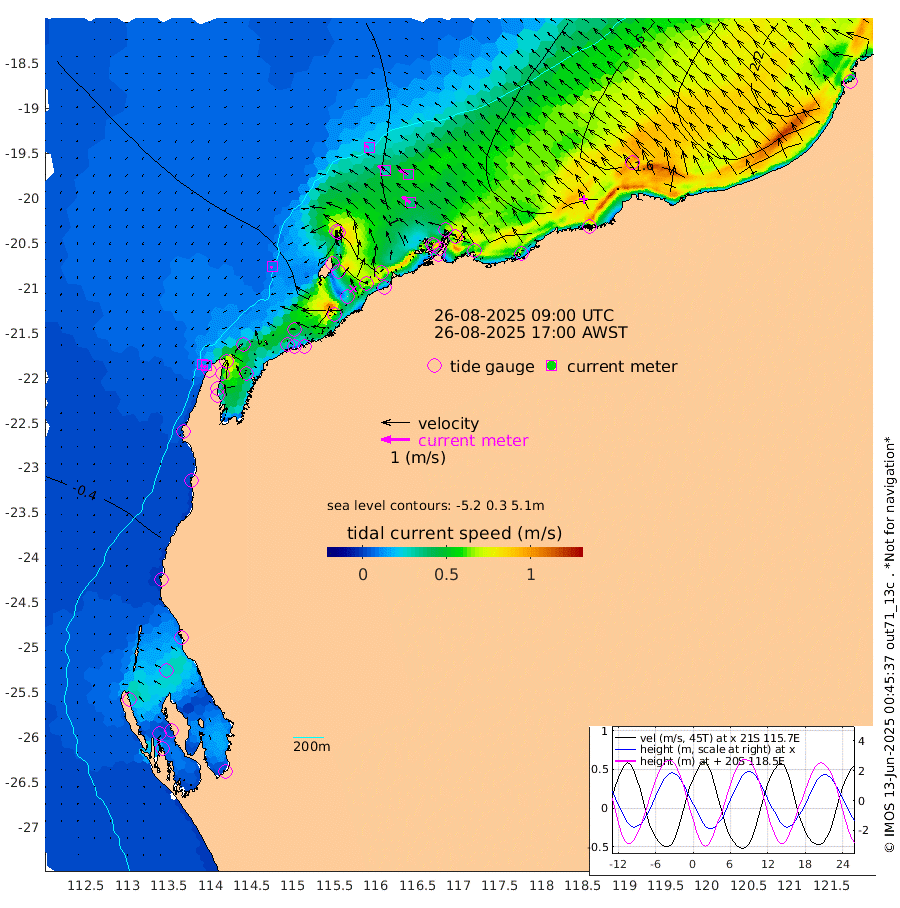 8cm/s -127T +12cm/s rms + 5cm/s -173T. NWSBAR 206m 11cm/s -140T +22cm/s rms + 10cm/s -148T. TAN100 109m 18cm/s -70T +11cm/s rms + 8cm/s -129T. PIL200 208m 30cm/s -55T +13cm/s rms + 7cm/s -137T. PIL100 105m 38cm/s -54T +12cm/s rms + 2cm/s -92T. PIL050 55m 11cm/s -135T +18cm/s rms + 4cm/s -149T. NRSNIN 61m 37cm/s -62T +6cm/s rms + 3cm/s 112T. NW Shelf M6 65m -11cm Withnell Point 4cm Denham 5cm Shark Bay (Inr Bn) 1cm Shark Bay 6cm Useless Loop 7cm Hamelin Pool -32cm Carnarvon -38cm Cape Cuvier -43cm Coral Bay -42cm Norwegian Bay -50cm Badjirrajirra -47cm Tantabiddi -46cm Point Murat -47cm Exmouth -49cm Learmonth -59cm Y Island -53cm North Muiron Island -59cm Roller -65cm Ashburton North -64cm Onslow (Beadon Creek) -66cm Thevenard Island -70cm Large Island -74cm North Sandy Island -75cm Barrow Island (Wapet Landing) -66cm Barrow Island (Tanker Mooring) -117cm Withnell Bay -63cm Trimouille Island -70cm North West Island -96cm Fortescue Road -108cm Steamboat Island -73cm Sholl Island -112cm Fairway Beacon -117cm Mawby Island -117cm Dampier (King Bay) -116cm Cape Legendre -108cm Hauy Island -133cm Port Walcott (Cape Lambert) -148cm Depuch Island -166cm Port Hedland -192cm Bedout Island -320cm Lagrange Bay