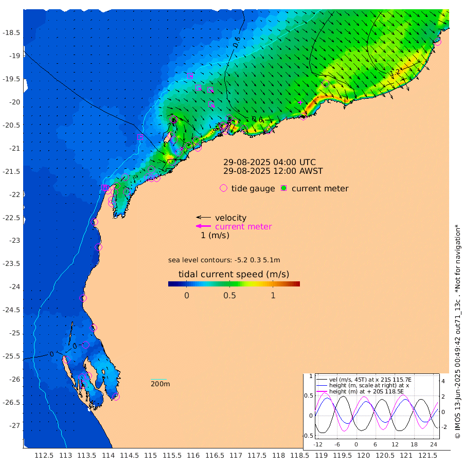 9cm/s 59T +12cm/s rms + 5cm/s -173T. NWSBAR 206m 7cm/s 41T +22cm/s rms + 10cm/s -148T. TAN100 109m 16cm/s 109T +11cm/s rms + 8cm/s -129T. PIL200 208m 25cm/s 129T +13cm/s rms + 7cm/s -137T. PIL100 105m 30cm/s 131T +12cm/s rms + 2cm/s -92T. PIL050 55m 7cm/s 48T +18cm/s rms + 4cm/s -149T. NRSNIN 61m 28cm/s 121T +6cm/s rms + 3cm/s 112T. NW Shelf M6 65m -12cm Withnell Point -22cm Denham -21cm Shark Bay (Inr Bn) -19cm Shark Bay -19cm Useless Loop 3cm Hamelin Pool -3cm Carnarvon 7cm Cape Cuvier 10cm Coral Bay 9cm Norwegian Bay 12cm Badjirrajirra 15cm Tantabiddi 11cm Point Murat 11cm Exmouth 11cm Learmonth 23cm Y Island 19cm North Muiron Island 25cm Roller 25cm Ashburton North 24cm Onslow (Beadon Creek) 26cm Thevenard Island 3cm Large Island 27cm North Sandy Island 31cm Barrow Island (Wapet Landing) 21cm Barrow Island (Tanker Mooring) 64cm Withnell Bay 22cm Trimouille Island 32cm North West Island 18cm Fortescue Road 64cm Steamboat Island 38cm Sholl Island 60cm Fairway Beacon 65cm Mawby Island 63cm Dampier (King Bay) 57cm Cape Legendre 58cm Hauy Island 74cm Port Walcott (Cape Lambert) 90cm Depuch Island 99cm Port Hedland 127cm Bedout Island 175cm Lagrange Bay