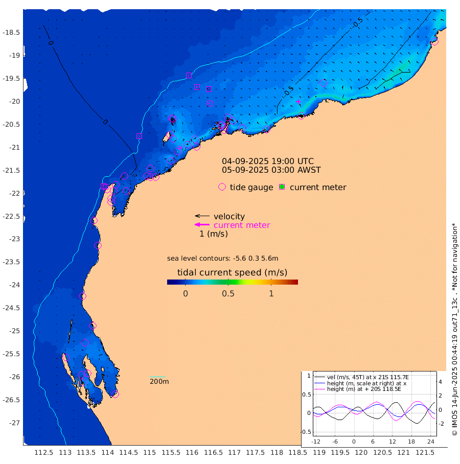 3cm/s -172T +12cm/s rms + 5cm/s -173T. NWSBAR 206m 1cm/s 19T +22cm/s rms + 10cm/s -148T. TAN100 109m 3cm/s -69T +11cm/s rms + 8cm/s -129T. PIL200 208m 5cm/s -53T +13cm/s rms + 7cm/s -137T. PIL100 105m 7cm/s -62T +12cm/s rms + 2cm/s -92T. PIL050 55m 0cm/s -49T +18cm/s rms + 4cm/s -149T. NRSNIN 61m 2cm/s -64T +6cm/s rms + 3cm/s 112T. NW Shelf M6 65m 10cm Withnell Point 12cm Denham 9cm Shark Bay (Inr Bn) 11cm Shark Bay 9cm Useless Loop -4cm Hamelin Pool 12cm Carnarvon 12cm Cape Cuvier 11cm Coral Bay 8cm Norwegian Bay 3cm Badjirrajirra 8cm Tantabiddi 6cm Point Murat 3cm Exmouth -2cm Learmonth 1cm Y Island 5cm North Muiron Island 1cm Roller 0cm Ashburton North 0cm Onslow (Beadon Creek) 0cm Thevenard Island -28cm Large Island -9cm North Sandy Island -6cm Barrow Island (Wapet Landing) -9cm Barrow Island (Tanker Mooring) -20cm Withnell Bay -7cm Trimouille Island 1cm North West Island -50cm Fortescue Road -2cm Steamboat Island -4cm Sholl Island -19cm Fairway Beacon -18cm Mawby Island -20cm Dampier (King Bay) -20cm Cape Legendre -22cm Hauy Island -28cm Port Walcott (Cape Lambert) -38cm Depuch Island -42cm Port Hedland -46cm Bedout Island -169cm Lagrange Bay