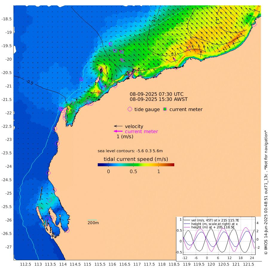 9cm/s -130T +12cm/s rms + 5cm/s -173T. NWSBAR 206m 12cm/s -139T +22cm/s rms + 10cm/s -148T. TAN100 109m 18cm/s -70T +11cm/s rms + 8cm/s -129T. PIL200 208m 31cm/s -55T +13cm/s rms + 7cm/s -137T. PIL100 105m 38cm/s -52T +12cm/s rms + 2cm/s -92T. PIL050 55m 12cm/s -134T +18cm/s rms + 4cm/s -149T. NRSNIN 61m 35cm/s -59T +6cm/s rms + 3cm/s 112T. NW Shelf M6 65m -7cm Withnell Point 13cm Denham 14cm Shark Bay (Inr Bn) 10cm Shark Bay 18cm Useless Loop 11cm Hamelin Pool -28cm Carnarvon -37cm Cape Cuvier -40cm Coral Bay -40cm Norwegian Bay -39cm Badjirrajirra -42cm Tantabiddi -38cm Point Murat -36cm Exmouth -35cm Learmonth -48cm Y Island -44cm North Muiron Island -49cm Roller -54cm Ashburton North -53cm Onslow (Beadon Creek) -55cm Thevenard Island -30cm Large Island -51cm North Sandy Island -60cm Barrow Island (Wapet Landing) -44cm Barrow Island (Tanker Mooring) -95cm Withnell Bay -49cm Trimouille Island -54cm North West Island -52cm Fortescue Road -82cm Steamboat Island -51cm Sholl Island -91cm Fairway Beacon -96cm Mawby Island -94cm Dampier (King Bay) -104cm Cape Legendre -84cm Hauy Island -103cm Port Walcott (Cape Lambert) -106cm Depuch Island -128cm Port Hedland -153cm Bedout Island -237cm Lagrange Bay