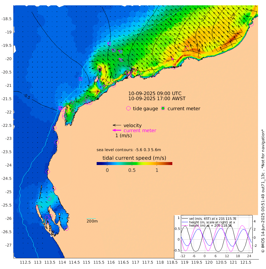 9cm/s -136T +12cm/s rms + 5cm/s -173T. NWSBAR 206m 11cm/s -139T +22cm/s rms + 10cm/s -148T. TAN100 109m 18cm/s -71T +11cm/s rms + 8cm/s -129T. PIL200 208m 30cm/s -56T +13cm/s rms + 7cm/s -137T. PIL100 105m 37cm/s -55T +12cm/s rms + 2cm/s -92T. PIL050 55m 11cm/s -134T +18cm/s rms + 4cm/s -149T. NRSNIN 61m 33cm/s -60T +6cm/s rms + 3cm/s 112T. NW Shelf M6 65m -10cm Withnell Point 7cm Denham 6cm Shark Bay (Inr Bn) 3cm Shark Bay 9cm Useless Loop 6cm Hamelin Pool -32cm Carnarvon -37cm Cape Cuvier -42cm Coral Bay -42cm Norwegian Bay -64cm Badjirrajirra -49cm Tantabiddi -54cm Point Murat -58cm Exmouth -62cm Learmonth -68cm Y Island -57cm North Muiron Island -66cm Roller -73cm Ashburton North -75cm Onslow (Beadon Creek) -75cm Thevenard Island -57cm Large Island -99cm North Sandy Island -93cm Barrow Island (Wapet Landing) -91cm Barrow Island (Tanker Mooring) -146cm Withnell Bay -86cm Trimouille Island -79cm North West Island -83cm Fortescue Road -133cm Steamboat Island -107cm Sholl Island -140cm Fairway Beacon -145cm Mawby Island -145cm Dampier (King Bay) -150cm Cape Legendre -140cm Hauy Island -171cm Port Walcott (Cape Lambert) -181cm Depuch Island -216cm Port Hedland -245cm Bedout Island -299cm Lagrange Bay