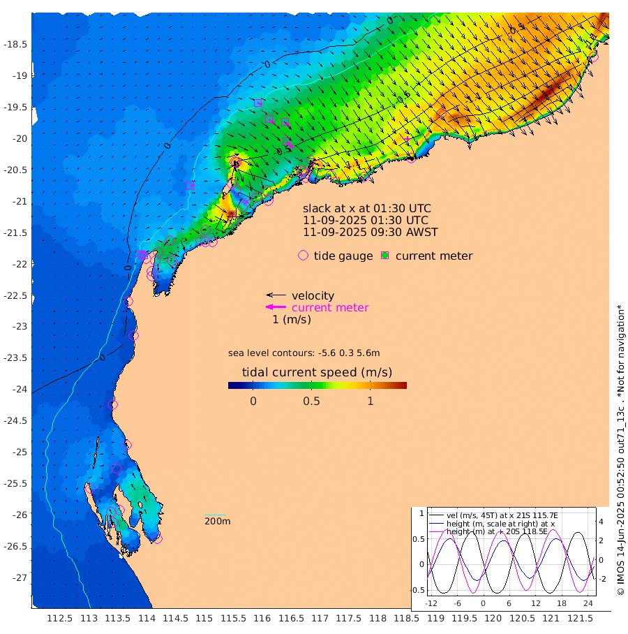 15cm/s 73T +12cm/s rms + 5cm/s -173T. NWSBAR 206m 11cm/s 42T +22cm/s rms + 10cm/s -148T. TAN100 109m 22cm/s 111T +11cm/s rms + 8cm/s -129T. PIL200 208m 37cm/s 131T +13cm/s rms + 7cm/s -137T. PIL100 105m 45cm/s 134T +12cm/s rms + 2cm/s -92T. PIL050 55m 11cm/s 49T +18cm/s rms + 4cm/s -149T. NRSNIN 61m 38cm/s 133T +6cm/s rms + 3cm/s 112T. NW Shelf M6 65m -30cm Withnell Point -40cm Denham -36cm Shark Bay (Inr Bn) -34cm Shark Bay -28cm Useless Loop 11cm Hamelin Pool -29cm Carnarvon -5cm Cape Cuvier -3cm Coral Bay -8cm Norwegian Bay -57cm Badjirrajirra -7cm Tantabiddi -35cm Point Murat -49cm Exmouth -59cm Learmonth -33cm Y Island -18cm North Muiron Island -23cm Roller -22cm Ashburton North -31cm Onslow (Beadon Creek) -23cm Thevenard Island -94cm Large Island -95cm North Sandy Island -48cm Barrow Island (Wapet Landing) -97cm Barrow Island (Tanker Mooring) -49cm Withnell Bay -55cm Trimouille Island -31cm North West Island -92cm Fortescue Road -60cm Steamboat Island -84cm Sholl Island -51cm Fairway Beacon -47cm Mawby Island -49cm Dampier (King Bay) -46cm Cape Legendre -77cm Hauy Island -73cm Port Walcott (Cape Lambert) -95cm Depuch Island -85cm Port Hedland -37cm Bedout Island -40cm Lagrange Bay