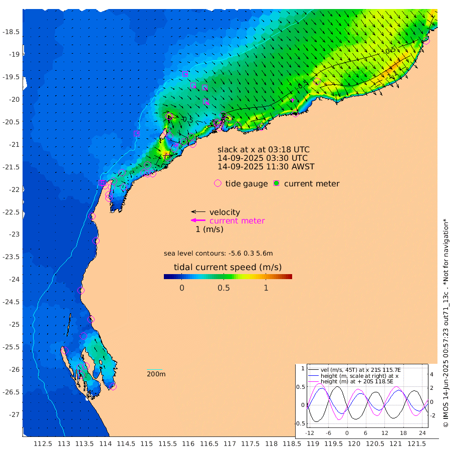 10cm/s 71T +12cm/s rms + 5cm/s -173T. NWSBAR 206m 6cm/s 42T +22cm/s rms + 10cm/s -148T. TAN100 109m 16cm/s 111T +11cm/s rms + 8cm/s -129T. PIL200 208m 26cm/s 132T +13cm/s rms + 7cm/s -137T. PIL100 105m 31cm/s 135T +12cm/s rms + 2cm/s -92T. PIL050 55m 5cm/s 55T +18cm/s rms + 4cm/s -149T. NRSNIN 61m 28cm/s 135T +6cm/s rms + 3cm/s 112T. NW Shelf M6 65m -38cm Withnell Point -39cm Denham -35cm Shark Bay (Inr Bn) -37cm Shark Bay -26cm Useless Loop 17cm Hamelin Pool -41cm Carnarvon -22cm Cape Cuvier -20cm Coral Bay -24cm Norwegian Bay -51cm Badjirrajirra -20cm Tantabiddi -37cm Point Murat -46cm Exmouth -49cm Learmonth -34cm Y Island -25cm North Muiron Island -26cm Roller -26cm Ashburton North -32cm Onslow (Beadon Creek) -27cm Thevenard Island -72cm Large Island -66cm North Sandy Island -40cm Barrow Island (Wapet Landing) -70cm Barrow Island (Tanker Mooring) -31cm Withnell Bay -38cm Trimouille Island -28cm North West Island -68cm Fortescue Road -37cm Steamboat Island -50cm Sholl Island -34cm Fairway Beacon -32cm Mawby Island -32cm Dampier (King Bay) -39cm Cape Legendre -48cm Hauy Island -41cm Port Walcott (Cape Lambert) -44cm Depuch Island -38cm Port Hedland 3cm Bedout Island -10cm Lagrange Bay