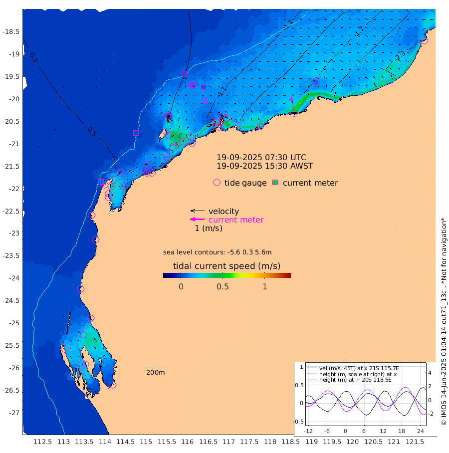 2cm/s -159T +12cm/s rms + 5cm/s -173T. NWSBAR 206m 5cm/s -136T +22cm/s rms + 10cm/s -148T. TAN100 109m 4cm/s -60T +11cm/s rms + 8cm/s -129T. PIL200 208m 8cm/s -62T +13cm/s rms + 7cm/s -137T. PIL100 105m 11cm/s -67T +12cm/s rms + 2cm/s -92T. PIL050 55m 6cm/s -141T +18cm/s rms + 4cm/s -149T. NRSNIN 61m 4cm/s -89T +6cm/s rms + 3cm/s 112T. NW Shelf M6 65m -28cm Withnell Point -18cm Denham -14cm Shark Bay (Inr Bn) -21cm Shark Bay -7cm Useless Loop 17cm Hamelin Pool -46cm Carnarvon -39cm Cape Cuvier -40cm Coral Bay -41cm Norwegian Bay -69cm Badjirrajirra -45cm Tantabiddi -56cm Point Murat -63cm Exmouth -66cm Learmonth -61cm Y Island -51cm North Muiron Island -56cm Roller -64cm Ashburton North -67cm Onslow (Beadon Creek) -66cm Thevenard Island -84cm Large Island -101cm North Sandy Island -84cm Barrow Island (Wapet Landing) -98cm Barrow Island (Tanker Mooring) -115cm Withnell Bay -78cm Trimouille Island -71cm North West Island -98cm Fortescue Road -108cm Steamboat Island -93cm Sholl Island -112cm Fairway Beacon -112cm Mawby Island -116cm Dampier (King Bay) -122cm Cape Legendre -120cm Hauy Island -137cm Port Walcott (Cape Lambert) -147cm Depuch Island -165cm Port Hedland -167cm Bedout Island -199cm Lagrange Bay