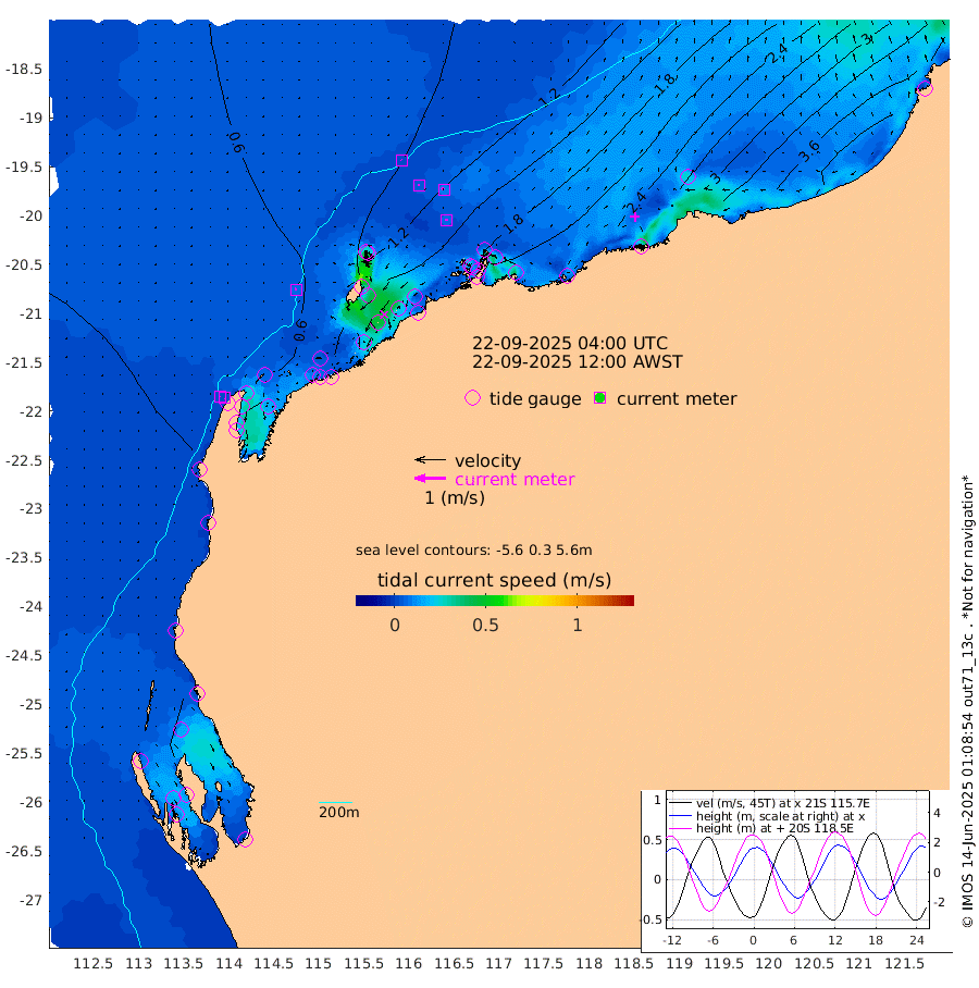 6cm/s -63T +12cm/s rms + 5cm/s -173T. NWSBAR 206m 1cm/s -146T +22cm/s rms + 10cm/s -148T. TAN100 109m 2cm/s -42T +11cm/s rms + 8cm/s -129T. PIL200 208m 5cm/s -19T +13cm/s rms + 7cm/s -137T. PIL100 105m 7cm/s 0T +12cm/s rms + 2cm/s -92T. PIL050 55m 1cm/s -127T +18cm/s rms + 4cm/s -149T. NRSNIN 61m 10cm/s -38T +6cm/s rms + 3cm/s 112T. NW Shelf M6 65m 23cm Withnell Point 16cm Denham 14cm Shark Bay (Inr Bn) 17cm Shark Bay 5cm Useless Loop -13cm Hamelin Pool 39cm Carnarvon 25cm Cape Cuvier 28cm Coral Bay 29cm Norwegian Bay 93cm Badjirrajirra 38cm Tantabiddi 65cm Point Murat 80cm Exmouth 99cm Learmonth 72cm Y Island 52cm North Muiron Island 64cm Roller 72cm Ashburton North 80cm Onslow (Beadon Creek) 75cm Thevenard Island 112cm Large Island 158cm North Sandy Island 113cm Barrow Island (Wapet Landing) 154cm Barrow Island (Tanker Mooring) 160cm Withnell Bay 114cm Trimouille Island 89cm North West Island 127cm Fortescue Road 153cm Steamboat Island 163cm Sholl Island 157cm Fairway Beacon 158cm Mawby Island 161cm Dampier (King Bay) 158cm Cape Legendre 180cm Hauy Island 206cm Port Walcott (Cape Lambert) 226cm Depuch Island 255cm Port Hedland 240cm Bedout Island 248cm Lagrange Bay