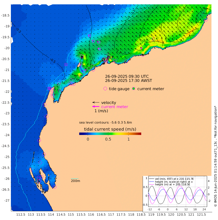 6cm/s -134T +12cm/s rms + 5cm/s -173T. NWSBAR 206m 7cm/s -141T +22cm/s rms + 10cm/s -148T. TAN100 109m 14cm/s -72T +11cm/s rms + 8cm/s -129T. PIL200 208m 23cm/s -57T +13cm/s rms + 7cm/s -137T. PIL100 105m 28cm/s -55T +12cm/s rms + 2cm/s -92T. PIL050 55m 7cm/s -134T +18cm/s rms + 4cm/s -149T. NRSNIN 61m 30cm/s -65T +6cm/s rms + 3cm/s 112T. NW Shelf M6 65m -9cm Withnell Point -5cm Denham -6cm Shark Bay (Inr Bn) -6cm Shark Bay -7cm Useless Loop -3cm Hamelin Pool -21cm Carnarvon -25cm Cape Cuvier -29cm Coral Bay -28cm Norwegian Bay -46cm Badjirrajirra -35cm Tantabiddi -38cm Point Murat -42cm Exmouth -47cm Learmonth -52cm Y Island -43cm North Muiron Island -52cm Roller -54cm Ashburton North -55cm Onslow (Beadon Creek) -55cm Thevenard Island -43cm Large Island -75cm North Sandy Island -68cm Barrow Island (Wapet Landing) -66cm Barrow Island (Tanker Mooring) -109cm Withnell Bay -56cm Trimouille Island -62cm North West Island -63cm Fortescue Road -100cm Steamboat Island -77cm Sholl Island -105cm Fairway Beacon -111cm Mawby Island -108cm Dampier (King Bay) -106cm Cape Legendre -104cm Hauy Island -129cm Port Walcott (Cape Lambert) -145cm Depuch Island -164cm Port Hedland -187cm Bedout Island -257cm Lagrange Bay