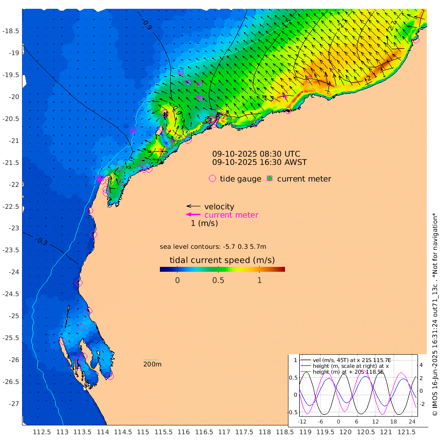 9cm/s -137T +12cm/s rms + 5cm/s -173T. NWSBAR 206m 8cm/s -138T +22cm/s rms + 10cm/s -148T. TAN100 109m 18cm/s -71T +11cm/s rms + 8cm/s -129T. PIL200 208m 29cm/s -57T +13cm/s rms + 7cm/s -137T. PIL100 105m 36cm/s -54T +12cm/s rms + 2cm/s -92T. PIL050 55m 8cm/s -133T +18cm/s rms + 4cm/s -149T. NRSNIN 61m 35cm/s -58T +6cm/s rms + 3cm/s 112T. NW Shelf M6 65m -4cm Withnell Point 6cm Denham 4cm Shark Bay (Inr Bn) 2cm Shark Bay 3cm Useless Loop -2cm Hamelin Pool -20cm Carnarvon -27cm Cape Cuvier -32cm Coral Bay -31cm Norwegian Bay -52cm Badjirrajirra -38cm Tantabiddi -42cm Point Murat -46cm Exmouth -50cm Learmonth -56cm Y Island -46cm North Muiron Island -55cm Roller -61cm Ashburton North -63cm Onslow (Beadon Creek) -63cm Thevenard Island -36cm Large Island -81cm North Sandy Island -80cm Barrow Island (Wapet Landing) -75cm Barrow Island (Tanker Mooring) -130cm Withnell Bay -72cm Trimouille Island -68cm North West Island -60cm Fortescue Road -118cm Steamboat Island -94cm Sholl Island -124cm Fairway Beacon -127cm Mawby Island -129cm Dampier (King Bay) -132cm Cape Legendre -124cm Hauy Island -153cm Port Walcott (Cape Lambert) -160cm Depuch Island -196cm Port Hedland -229cm Bedout Island -265cm Lagrange Bay