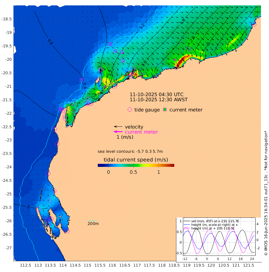 7cm/s 16T +12cm/s rms + 5cm/s -173T. NWSBAR 206m 6cm/s 47T +22cm/s rms + 10cm/s -148T. TAN100 109m 12cm/s 104T +11cm/s rms + 8cm/s -129T. PIL200 208m 17cm/s 120T +13cm/s rms + 7cm/s -137T. PIL100 105m 20cm/s 122T +12cm/s rms + 2cm/s -92T. PIL050 55m 6cm/s 48T +18cm/s rms + 4cm/s -149T. NRSNIN 61m 22cm/s 121T +6cm/s rms + 3cm/s 112T. NW Shelf M6 65m -11cm Withnell Point -35cm Denham -35cm Shark Bay (Inr Bn) -34cm Shark Bay -44cm Useless Loop -13cm Hamelin Pool 13cm Carnarvon 16cm Cape Cuvier 20cm Coral Bay 23cm Norwegian Bay 67cm Badjirrajirra 30cm Tantabiddi 46cm Point Murat 56cm Exmouth 72cm Learmonth 59cm Y Island 42cm North Muiron Island 56cm Roller 62cm Ashburton North 67cm Onslow (Beadon Creek) 64cm Thevenard Island 70cm Large Island 126cm North Sandy Island 96cm Barrow Island (Wapet Landing) 117cm Barrow Island (Tanker Mooring) 153cm Withnell Bay 97cm Trimouille Island 73cm North West Island 96cm Fortescue Road 143cm Steamboat Island 149cm Sholl Island 149cm Fairway Beacon 153cm Mawby Island 154cm Dampier (King Bay) 153cm Cape Legendre 165cm Hauy Island 194cm Port Walcott (Cape Lambert) 207cm Depuch Island 249cm Port Hedland 254cm Bedout Island 311cm Lagrange Bay