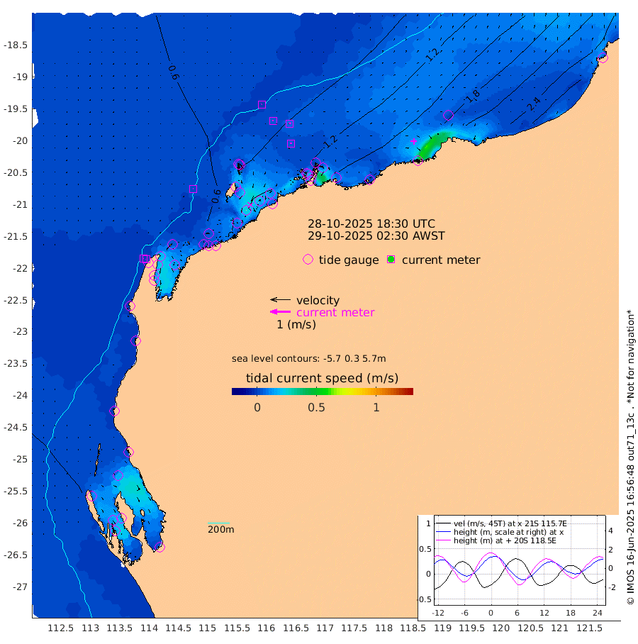 2cm/s -67T +12cm/s rms + 5cm/s -173T. NWSBAR 206m 1cm/s -121T +22cm/s rms + 10cm/s -148T. TAN100 109m 1cm/s 22T +11cm/s rms + 8cm/s -129T. PIL200 208m 4cm/s -20T +13cm/s rms + 7cm/s -137T. PIL100 105m 5cm/s -9T +12cm/s rms + 2cm/s -92T. PIL050 55m 1cm/s -104T +18cm/s rms + 4cm/s -149T. NRSNIN 61m 7cm/s 57T +6cm/s rms + 3cm/s 112T. NW Shelf M6 65m 37cm Withnell Point 38cm Denham 36cm Shark Bay (Inr Bn) 41cm Shark Bay 33cm Useless Loop -6cm Hamelin Pool 47cm Carnarvon 36cm Cape Cuvier 38cm Coral Bay 40cm Norwegian Bay 78cm Badjirrajirra 43cm Tantabiddi 61cm Point Murat 71cm Exmouth 72cm Learmonth 71cm Y Island 55cm North Muiron Island 63cm Roller 62cm Ashburton North 68cm Onslow (Beadon Creek) 65cm Thevenard Island 112cm Large Island 110cm North Sandy Island 86cm Barrow Island (Wapet Landing) 110cm Barrow Island (Tanker Mooring) 109cm Withnell Bay 79cm Trimouille Island 71cm North West Island 120cm Fortescue Road 115cm Steamboat Island 109cm Sholl Island 108cm Fairway Beacon 108cm Mawby Island 109cm Dampier (King Bay) 106cm Cape Legendre 120cm Hauy Island 132cm Port Walcott (Cape Lambert) 144cm Depuch Island 158cm Port Hedland 154cm Bedout Island 240cm Lagrange Bay