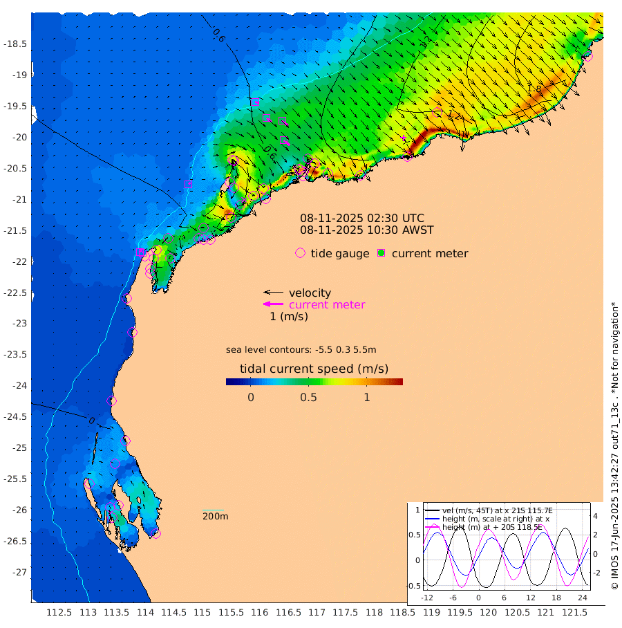 10cm/s 46T +12cm/s rms + 5cm/s -173T. NWSBAR 206m 10cm/s 46T +22cm/s rms + 10cm/s -148T. TAN100 109m 20cm/s 108T +11cm/s rms + 8cm/s -129T. PIL200 208m 32cm/s 126T +13cm/s rms + 7cm/s -137T. PIL100 105m 39cm/s 130T +12cm/s rms + 2cm/s -92T. PIL050 55m 10cm/s 49T +18cm/s rms + 4cm/s -149T. NRSNIN 61m 39cm/s 128T +6cm/s rms + 3cm/s 112T. NW Shelf M6 65m -32cm Withnell Point -56cm Denham -53cm Shark Bay (Inr Bn) -54cm Shark Bay -55cm Useless Loop -4cm Hamelin Pool -14cm Carnarvon 2cm Cape Cuvier 6cm Coral Bay 7cm Norwegian Bay 12cm Badjirrajirra 11cm Tantabiddi 8cm Point Murat 8cm Exmouth 17cm Learmonth 19cm Y Island 15cm North Muiron Island 23cm Roller 27cm Ashburton North 26cm Onslow (Beadon Creek) 28cm Thevenard Island -3cm Large Island 37cm North Sandy Island 39cm Barrow Island (Wapet Landing) 28cm Barrow Island (Tanker Mooring) 82cm Withnell Bay 40cm Trimouille Island 31cm North West Island 20cm Fortescue Road 67cm Steamboat Island 61cm Sholl Island 77cm Fairway Beacon 82cm Mawby Island 82cm Dampier (King Bay) 83cm Cape Legendre 78cm Hauy Island 100cm Port Walcott (Cape Lambert) 102cm Depuch Island 135cm Port Hedland 159cm Bedout Island 223cm Lagrange Bay