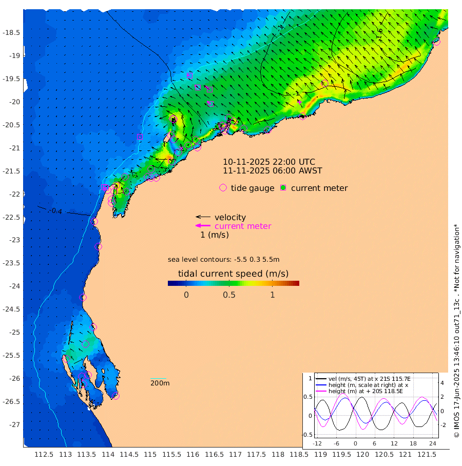 7cm/s -135T +12cm/s rms + 5cm/s -173T. NWSBAR 206m 12cm/s -138T +22cm/s rms + 10cm/s -148T. TAN100 109m 16cm/s -73T +11cm/s rms + 8cm/s -129T. PIL200 208m 27cm/s -54T +13cm/s rms + 7cm/s -137T. PIL100 105m 32cm/s -52T +12cm/s rms + 2cm/s -92T. PIL050 55m 12cm/s -133T +18cm/s rms + 4cm/s -149T. NRSNIN 61m 41cm/s -53T +6cm/s rms + 3cm/s 112T. NW Shelf M6 65m -2cm Withnell Point 27cm Denham 28cm Shark Bay (Inr Bn) 23cm Shark Bay 36cm Useless Loop 16cm Hamelin Pool -23cm Carnarvon -35cm Cape Cuvier -37cm Coral Bay -37cm Norwegian Bay -36cm Badjirrajirra -39cm Tantabiddi -36cm Point Murat -34cm Exmouth -37cm Learmonth -44cm Y Island -42cm North Muiron Island -49cm Roller -50cm Ashburton North -48cm Onslow (Beadon Creek) -51cm Thevenard Island -41cm Large Island -58cm North Sandy Island -56cm Barrow Island (Wapet Landing) -48cm Barrow Island (Tanker Mooring) -86cm Withnell Bay -59cm Trimouille Island -50cm North West Island -51cm Fortescue Road -80cm Steamboat Island -64cm Sholl Island -84cm Fairway Beacon -86cm Mawby Island -87cm Dampier (King Bay) -85cm Cape Legendre -77cm Hauy Island -97cm Port Walcott (Cape Lambert) -101cm Depuch Island -120cm Port Hedland -136cm Bedout Island -231cm Lagrange Bay