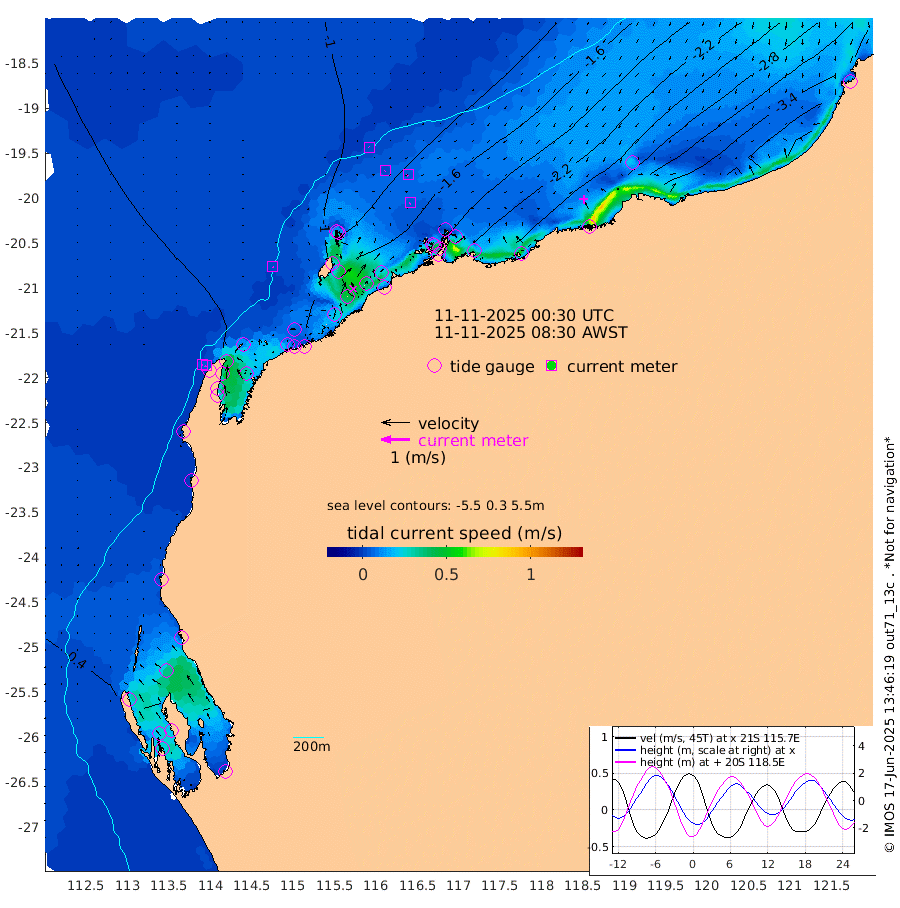 3cm/s 126T +12cm/s rms + 5cm/s -173T. NWSBAR 206m 4cm/s -139T +22cm/s rms + 10cm/s -148T. TAN100 109m 1cm/s -62T +11cm/s rms + 8cm/s -129T. PIL200 208m 2cm/s -125T +13cm/s rms + 7cm/s -137T. PIL100 105m 5cm/s -127T +12cm/s rms + 2cm/s -92T. PIL050 55m 5cm/s -140T +18cm/s rms + 4cm/s -149T. NRSNIN 61m 5cm/s -128T +6cm/s rms + 3cm/s 112T. NW Shelf M6 65m -39cm Withnell Point -19cm Denham -14cm Shark Bay (Inr Bn) -22cm Shark Bay 0cm Useless Loop 26cm Hamelin Pool -65cm Carnarvon -53cm Cape Cuvier -55cm Coral Bay -58cm Norwegian Bay -108cm Badjirrajirra -61cm Tantabiddi -85cm Point Murat -97cm Exmouth -105cm Learmonth -92cm Y Island -73cm North Muiron Island -83cm Roller -89cm Ashburton North -96cm Onslow (Beadon Creek) -92cm Thevenard Island -147cm Large Island -159cm North Sandy Island -122cm Barrow Island (Wapet Landing) -156cm Barrow Island (Tanker Mooring) -157cm Withnell Bay -119cm Trimouille Island -95cm North West Island -162cm Fortescue Road -154cm Steamboat Island -160cm Sholl Island -157cm Fairway Beacon -157cm Mawby Island -159cm Dampier (King Bay) -162cm Cape Legendre -170cm Hauy Island -193cm Port Walcott (Cape Lambert) -197cm Depuch Island -229cm Port Hedland -215cm Bedout Island -296cm Lagrange Bay