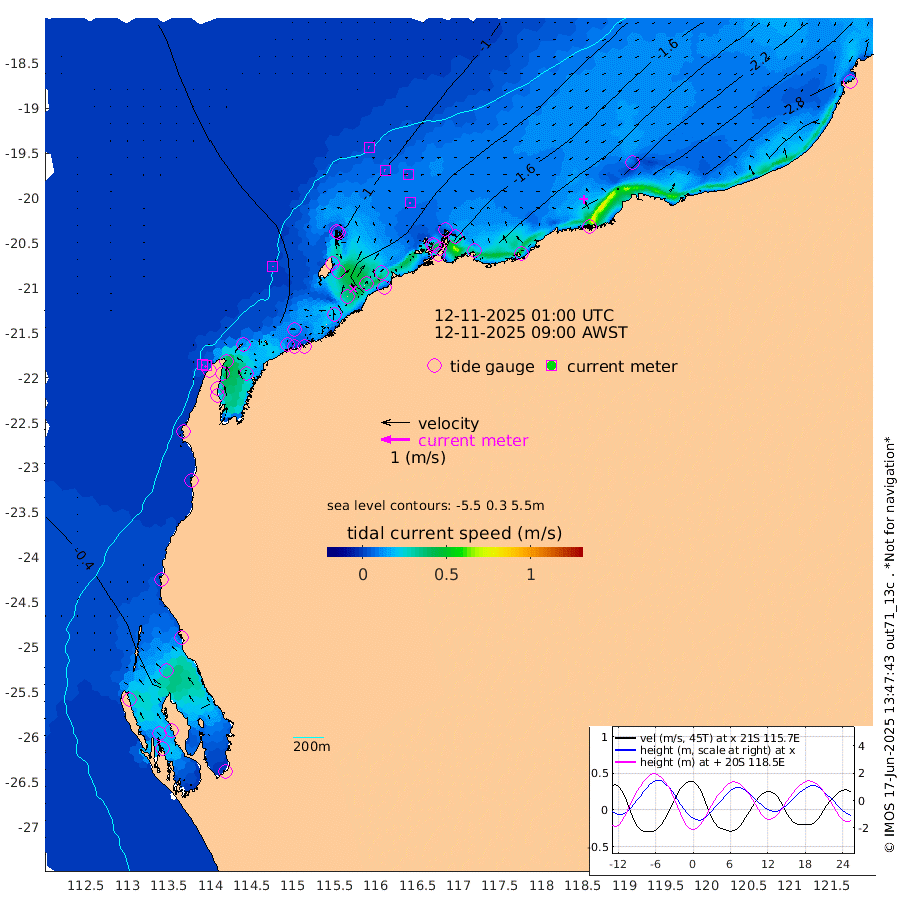 2cm/s 164T +12cm/s rms + 5cm/s -173T. NWSBAR 206m 4cm/s -138T +22cm/s rms + 10cm/s -148T. TAN100 109m 3cm/s -64T +11cm/s rms + 8cm/s -129T. PIL200 208m 4cm/s -77T +13cm/s rms + 7cm/s -137T. PIL100 105m 6cm/s -89T +12cm/s rms + 2cm/s -92T. PIL050 55m 5cm/s -138T +18cm/s rms + 4cm/s -149T. NRSNIN 61m 5cm/s -105T +6cm/s rms + 3cm/s 112T. NW Shelf M6 65m -30cm Withnell Point -12cm Denham -8cm Shark Bay (Inr Bn) -16cm Shark Bay 3cm Useless Loop 21cm Hamelin Pool -52cm Carnarvon -44cm Cape Cuvier -46cm Coral Bay -49cm Norwegian Bay -86cm Badjirrajirra -50cm Tantabiddi -68cm Point Murat -77cm Exmouth -81cm Learmonth -75cm Y Island -60cm North Muiron Island -66cm Roller -73cm Ashburton North -77cm Onslow (Beadon Creek) -75cm Thevenard Island -123cm Large Island -123cm North Sandy Island -97cm Barrow Island (Wapet Landing) -121cm Barrow Island (Tanker Mooring) -125cm Withnell Bay -94cm Trimouille Island -75cm North West Island -139cm Fortescue Road -122cm Steamboat Island -127cm Sholl Island -125cm Fairway Beacon -124cm Mawby Island -127cm Dampier (King Bay) -128cm Cape Legendre -133cm Hauy Island -152cm Port Walcott (Cape Lambert) -151cm Depuch Island -181cm Port Hedland -175cm Bedout Island -250cm Lagrange Bay