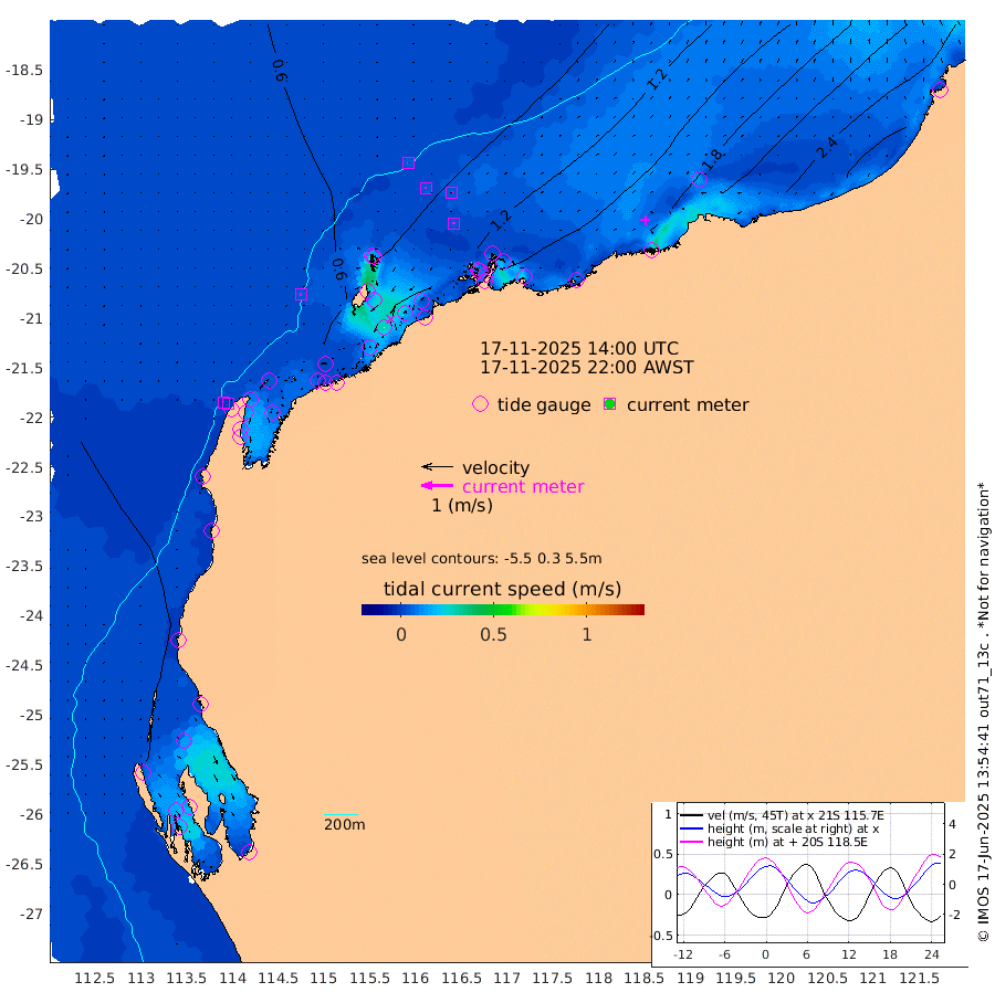 5cm/s -86T +12cm/s rms + 5cm/s -173T. NWSBAR 206m 0cm/s 28T +22cm/s rms + 10cm/s -148T. TAN100 109m 4cm/s -78T +11cm/s rms + 8cm/s -129T. PIL200 208m 4cm/s -17T +13cm/s rms + 7cm/s -137T. PIL100 105m 6cm/s -4T +12cm/s rms + 2cm/s -92T. PIL050 55m 0cm/s -54T +18cm/s rms + 4cm/s -149T. NRSNIN 61m 6cm/s 62T +6cm/s rms + 3cm/s 112T. NW Shelf M6 65m 35cm Withnell Point 35cm Denham 31cm Shark Bay (Inr Bn) 35cm Shark Bay 28cm Useless Loop -7cm Hamelin Pool 43cm Carnarvon 30cm Cape Cuvier 32cm Coral Bay 33cm Norwegian Bay 76cm Badjirrajirra 38cm Tantabiddi 58cm Point Murat 68cm Exmouth 76cm Learmonth 62cm Y Island 48cm North Muiron Island 56cm Roller 62cm Ashburton North 67cm Onslow (Beadon Creek) 64cm Thevenard Island 74cm Large Island 114cm North Sandy Island 89cm Barrow Island (Wapet Landing) 114cm Barrow Island (Tanker Mooring) 118cm Withnell Bay 79cm Trimouille Island 73cm North West Island 93cm Fortescue Road 114cm Steamboat Island 102cm Sholl Island 117cm Fairway Beacon 117cm Mawby Island 118cm Dampier (King Bay) 122cm Cape Legendre 127cm Hauy Island 147cm Port Walcott (Cape Lambert) 160cm Depuch Island 178cm Port Hedland 171cm Bedout Island 189cm Lagrange Bay