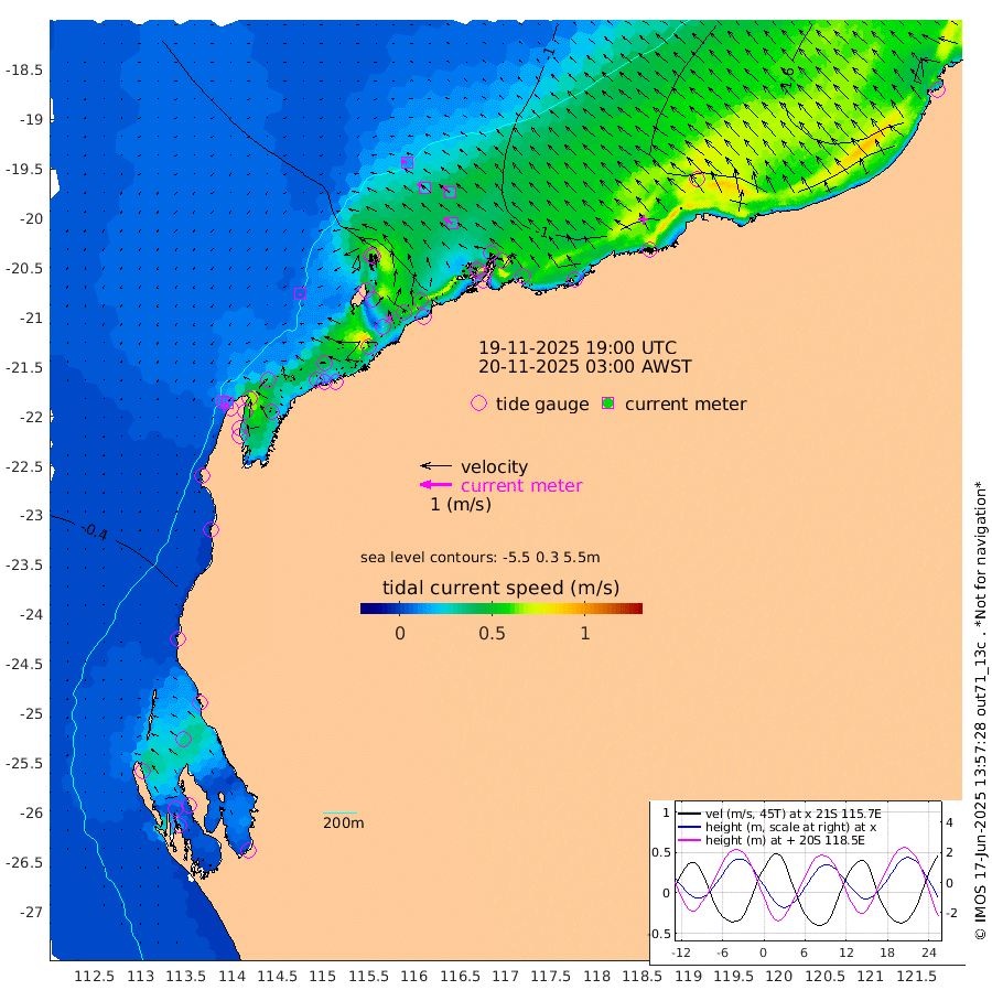 6cm/s -152T +12cm/s rms + 5cm/s -173T. NWSBAR 206m 10cm/s -138T +22cm/s rms + 10cm/s -148T. TAN100 109m 14cm/s -76T +11cm/s rms + 8cm/s -129T. PIL200 208m 26cm/s -57T +13cm/s rms + 7cm/s -137T. PIL100 105m 32cm/s -55T +12cm/s rms + 2cm/s -92T. PIL050 55m 11cm/s -133T +18cm/s rms + 4cm/s -149T. NRSNIN 61m 33cm/s -53T +6cm/s rms + 3cm/s 112T. NW Shelf M6 65m -15cm Withnell Point 13cm Denham 14cm Shark Bay (Inr Bn) 10cm Shark Bay 25cm Useless Loop 21cm Hamelin Pool -37cm Carnarvon -42cm Cape Cuvier -45cm Coral Bay -47cm Norwegian Bay -49cm Badjirrajirra -48cm Tantabiddi -46cm Point Murat -47cm Exmouth -52cm Learmonth -55cm Y Island -52cm North Muiron Island -60cm Roller -61cm Ashburton North -59cm Onslow (Beadon Creek) -63cm Thevenard Island -48cm Large Island -74cm North Sandy Island -70cm Barrow Island (Wapet Landing) -63cm Barrow Island (Tanker Mooring) -103cm Withnell Bay -73cm Trimouille Island -62cm North West Island -60cm Fortescue Road -90cm Steamboat Island -73cm Sholl Island -99cm Fairway Beacon -101cm Mawby Island -103cm Dampier (King Bay) -106cm Cape Legendre -97cm Hauy Island -115cm Port Walcott (Cape Lambert) -129cm Depuch Island -140cm Port Hedland -142cm Bedout Island -244cm Lagrange Bay
