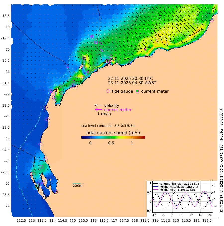 6cm/s -150T +12cm/s rms + 5cm/s -173T. NWSBAR 206m 12cm/s -139T +22cm/s rms + 10cm/s -148T. TAN100 109m 15cm/s -75T +11cm/s rms + 8cm/s -129T. PIL200 208m 27cm/s -56T +13cm/s rms + 7cm/s -137T. PIL100 105m 33cm/s -55T +12cm/s rms + 2cm/s -92T. PIL050 55m 13cm/s -134T +18cm/s rms + 4cm/s -149T. NRSNIN 61m 41cm/s -58T +6cm/s rms + 3cm/s 112T. NW Shelf M6 65m -18cm Withnell Point 13cm Denham 16cm Shark Bay (Inr Bn) 10cm Shark Bay 26cm Useless Loop 23cm Hamelin Pool -43cm Carnarvon -48cm Cape Cuvier -50cm Coral Bay -52cm Norwegian Bay -58cm Badjirrajirra -54cm Tantabiddi -54cm Point Murat -55cm Exmouth -58cm Learmonth -65cm Y Island -59cm North Muiron Island -70cm Roller -69cm Ashburton North -69cm Onslow (Beadon Creek) -71cm Thevenard Island -49cm Large Island -87cm North Sandy Island -80cm Barrow Island (Wapet Landing) -77cm Barrow Island (Tanker Mooring) -118cm Withnell Bay -79cm Trimouille Island -74cm North West Island -62cm Fortescue Road -118cm Steamboat Island -83cm Sholl Island -115cm Fairway Beacon -118cm Mawby Island -117cm Dampier (King Bay) -121cm Cape Legendre -114cm Hauy Island -132cm Port Walcott (Cape Lambert) -154cm Depuch Island -160cm Port Hedland -164cm Bedout Island -281cm Lagrange Bay