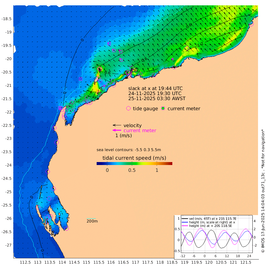 8cm/s -106T +12cm/s rms + 5cm/s -173T. NWSBAR 206m 11cm/s -138T +22cm/s rms + 10cm/s -148T. TAN100 109m 14cm/s -72T +11cm/s rms + 8cm/s -129T. PIL200 208m 26cm/s -50T +13cm/s rms + 7cm/s -137T. PIL100 105m 30cm/s -45T +12cm/s rms + 2cm/s -92T. PIL050 55m 10cm/s -132T +18cm/s rms + 4cm/s -149T. NRSNIN 61m 36cm/s -48T +6cm/s rms + 3cm/s 112T. NW Shelf M6 65m 21cm Withnell Point 42cm Denham 41cm Shark Bay (Inr Bn) 41cm Shark Bay 44cm Useless Loop 6cm Hamelin Pool 13cm Carnarvon -5cm Cape Cuvier -4cm Coral Bay -2cm Norwegian Bay 38cm Badjirrajirra -1cm Tantabiddi 21cm Point Murat 32cm Exmouth 36cm Learmonth 23cm Y Island 9cm North Muiron Island 10cm Roller 12cm Ashburton North 18cm Onslow (Beadon Creek) 14cm Thevenard Island 104cm Large Island 61cm North Sandy Island 33cm Barrow Island (Wapet Landing) 68cm Barrow Island (Tanker Mooring) 33cm Withnell Bay 30cm Trimouille Island 19cm North West Island 111cm Fortescue Road 31cm Steamboat Island 57cm Sholl Island 34cm Fairway Beacon 30cm Mawby Island 34cm Dampier (King Bay) 25cm Cape Legendre 51cm Hauy Island 53cm Port Walcott (Cape Lambert) 59cm Depuch Island 64cm Port Hedland 49cm Bedout Island 94cm Lagrange Bay