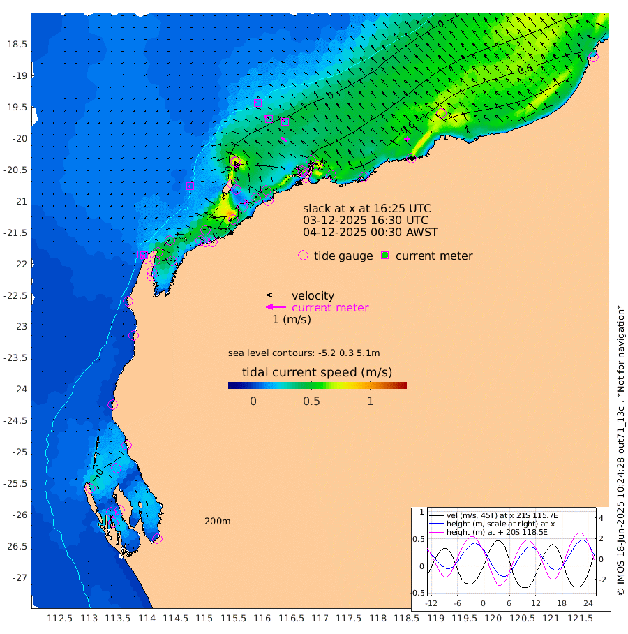 10cm/s -116T +12cm/s rms + 5cm/s -173T. NWSBAR 206m 10cm/s -136T +22cm/s rms + 10cm/s -148T. TAN100 109m 17cm/s -75T +11cm/s rms + 8cm/s -129T. PIL200 208m 29cm/s -53T +13cm/s rms + 7cm/s -137T. PIL100 105m 34cm/s -48T +12cm/s rms + 2cm/s -92T. PIL050 55m 11cm/s -131T +18cm/s rms + 4cm/s -149T. NRSNIN 61m 27cm/s -47T +6cm/s rms + 3cm/s 112T. NW Shelf M6 65m 14cm Withnell Point 40cm Denham 39cm Shark Bay (Inr Bn) 39cm Shark Bay 45cm Useless Loop 13cm Hamelin Pool 0cm Carnarvon -18cm Cape Cuvier -17cm Coral Bay -18cm Norwegian Bay 17cm Badjirrajirra -14cm Tantabiddi 4cm Point Murat 13cm Exmouth 14cm Learmonth 4cm Y Island -7cm North Muiron Island -5cm Roller -6cm Ashburton North 0cm Onslow (Beadon Creek) -5cm Thevenard Island 64cm Large Island 38cm North Sandy Island 10cm Barrow Island (Wapet Landing) 45cm Barrow Island (Tanker Mooring) 7cm Withnell Bay 10cm Trimouille Island 1cm North West Island 71cm Fortescue Road 14cm Steamboat Island 20cm Sholl Island 9cm Fairway Beacon 3cm Mawby Island 7cm Dampier (King Bay) -3cm Cape Legendre 25cm Hauy Island 23cm Port Walcott (Cape Lambert) 41cm Depuch Island 29cm Port Hedland 24cm Bedout Island 67cm Lagrange Bay