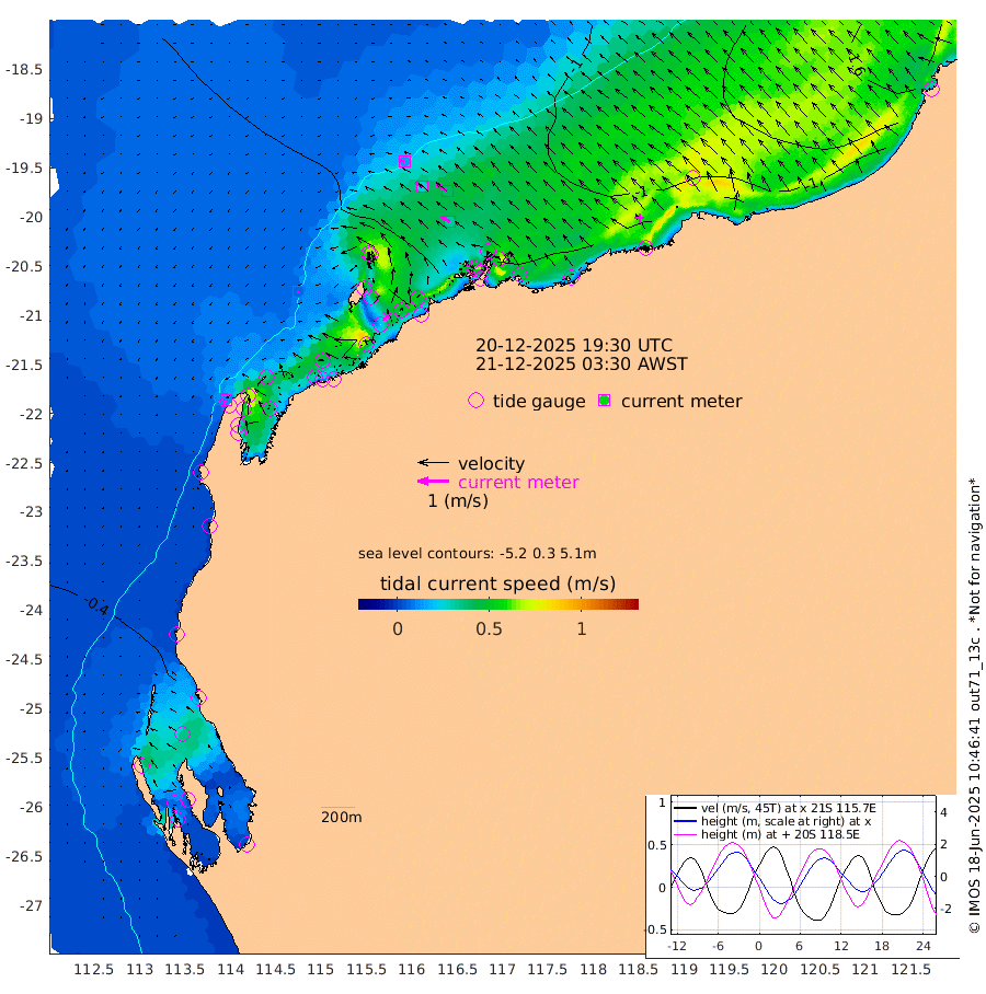 6cm/s -143T +12cm/s rms + 5cm/s -173T. NWSBAR 206m 12cm/s -138T +22cm/s rms + 10cm/s -148T. TAN100 109m 14cm/s -74T +11cm/s rms + 8cm/s -129T. PIL200 208m 26cm/s -56T +13cm/s rms + 7cm/s -137T. PIL100 105m 32cm/s -54T +12cm/s rms + 2cm/s -92T. PIL050 55m 13cm/s -135T +18cm/s rms + 4cm/s -149T. NRSNIN 61m 40cm/s -58T +6cm/s rms + 3cm/s 112T. NW Shelf M6 65m -16cm Withnell Point 13cm Denham 17cm Shark Bay (Inr Bn) 11cm Shark Bay 26cm Useless Loop 22cm Hamelin Pool -38cm Carnarvon -44cm Cape Cuvier -46cm Coral Bay -48cm Norwegian Bay -44cm Badjirrajirra -48cm Tantabiddi -43cm Point Murat -42cm Exmouth -42cm Learmonth -52cm Y Island -50cm North Muiron Island -58cm Roller -57cm Ashburton North -55cm Onslow (Beadon Creek) -58cm Thevenard Island -36cm Large Island -59cm North Sandy Island -61cm Barrow Island (Wapet Landing) -51cm Barrow Island (Tanker Mooring) -88cm Withnell Bay -58cm Trimouille Island -58cm North West Island -49cm Fortescue Road -86cm Steamboat Island -53cm Sholl Island -85cm Fairway Beacon -89cm Mawby Island -87cm Dampier (King Bay) -94cm Cape Legendre -82cm Hauy Island -94cm Port Walcott (Cape Lambert) -110cm Depuch Island -112cm Port Hedland -115cm Bedout Island -244cm Lagrange Bay