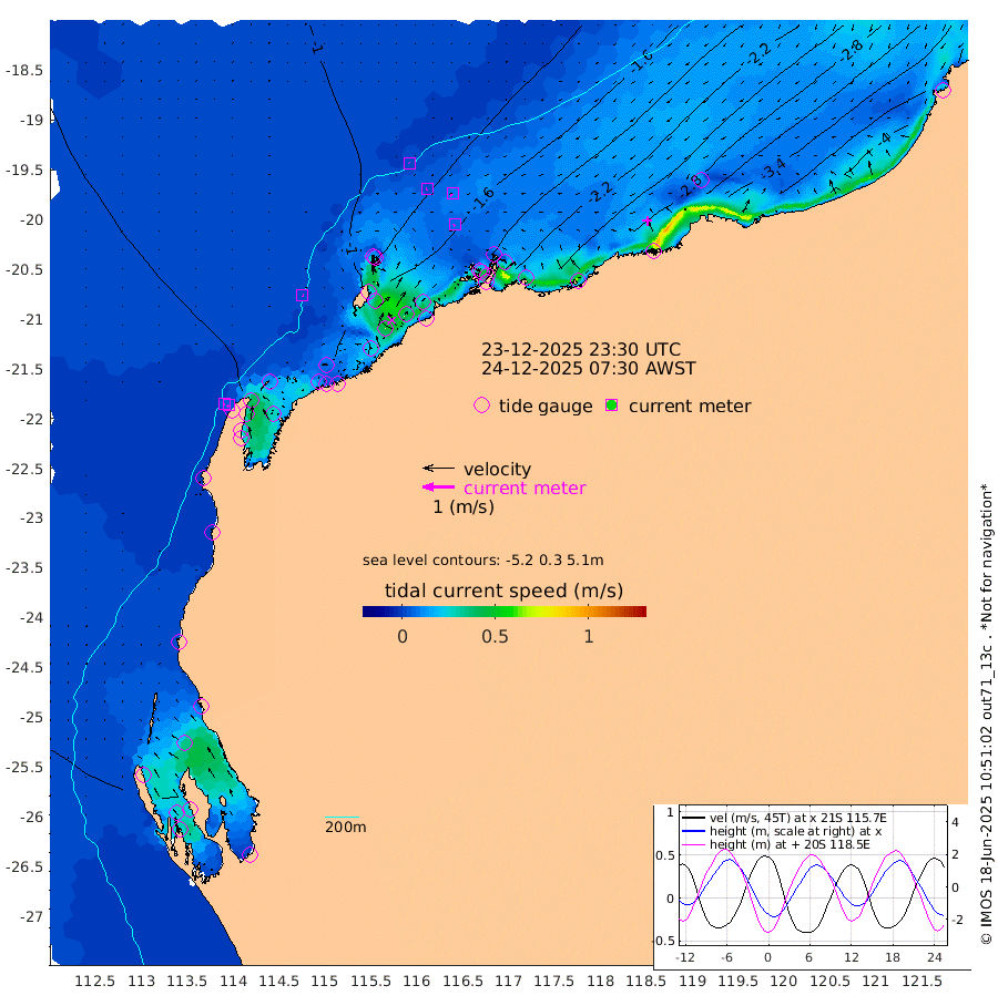 2cm/s 117T +12cm/s rms + 5cm/s -173T. NWSBAR 206m 5cm/s -144T +22cm/s rms + 10cm/s -148T. TAN100 109m 2cm/s -62T +11cm/s rms + 8cm/s -129T. PIL200 208m 3cm/s -96T +13cm/s rms + 7cm/s -137T. PIL100 105m 6cm/s -106T +12cm/s rms + 2cm/s -92T. PIL050 55m 5cm/s -143T +18cm/s rms + 4cm/s -149T. NRSNIN 61m 10cm/s -131T +6cm/s rms + 3cm/s 112T. NW Shelf M6 65m -45cm Withnell Point -30cm Denham -24cm Shark Bay (Inr Bn) -32cm Shark Bay -13cm Useless Loop 23cm Hamelin Pool -70cm Carnarvon -56cm Cape Cuvier -58cm Coral Bay -60cm Norwegian Bay -113cm Badjirrajirra -65cm Tantabiddi -89cm Point Murat -101cm Exmouth -108cm Learmonth -100cm Y Island -79cm North Muiron Island -90cm Roller -95cm Ashburton North -102cm Onslow (Beadon Creek) -98cm Thevenard Island -155cm Large Island -167cm North Sandy Island -128cm Barrow Island (Wapet Landing) -163cm Barrow Island (Tanker Mooring) -170cm Withnell Bay -117cm Trimouille Island -106cm North West Island -177cm Fortescue Road -172cm Steamboat Island -156cm Sholl Island -169cm Fairway Beacon -171cm Mawby Island -171cm Dampier (King Bay) -169cm Cape Legendre -183cm Hauy Island -206cm Port Walcott (Cape Lambert) -233cm Depuch Island -248cm Port Hedland -234cm Bedout Island -354cm Lagrange Bay