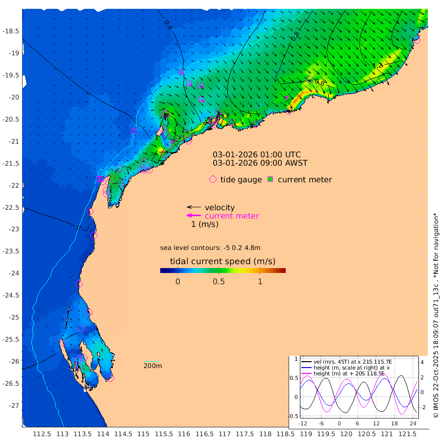 8cm/s 37T +12cm/s rms + 5cm/s -173T. NWSBAR 206m 7cm/s 50T +22cm/s rms + 10cm/s -148T. TAN100 109m 14cm/s 109T +11cm/s rms + 8cm/s -129T. PIL200 208m 23cm/s 126T +13cm/s rms + 7cm/s -137T. PIL100 105m 28cm/s 130T +12cm/s rms + 2cm/s -92T. PIL050 55m 7cm/s 49T +18cm/s rms + 4cm/s -149T. NRSNIN 61m 31cm/s 129T +6cm/s rms + 3cm/s 112T. NW Shelf M6 65m -34cm Withnell Point -57cm Denham -55cm Shark Bay (Inr Bn) -56cm Shark Bay -59cm Useless Loop -7cm Hamelin Pool -19cm Carnarvon -6cm Cape Cuvier -4cm Coral Bay -1cm Norwegian Bay -1cm Badjirrajirra -1cm Tantabiddi -4cm Point Murat -4cm Exmouth 3cm Learmonth 3cm Y Island 1cm North Muiron Island 7cm Roller 10cm Ashburton North 9cm Onslow (Beadon Creek) 10cm Thevenard Island 1cm Large Island 15cm North Sandy Island 18cm Barrow Island (Wapet Landing) 9cm Barrow Island (Tanker Mooring) 47cm Withnell Bay 20cm Trimouille Island 10cm North West Island 25cm Fortescue Road 32cm Steamboat Island 32cm Sholl Island 45cm Fairway Beacon 46cm Mawby Island 48cm Dampier (King Bay) 54cm Cape Legendre 48cm Hauy Island 59cm Port Walcott (Cape Lambert) 56cm Depuch Island 83cm Port Hedland 95cm Bedout Island 199cm Lagrange Bay