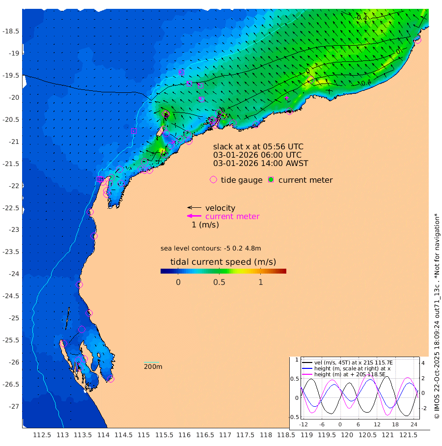 8cm/s -123T +12cm/s rms + 5cm/s -173T. NWSBAR 206m 3cm/s -131T +22cm/s rms + 10cm/s -148T. TAN100 109m 13cm/s -73T +11cm/s rms + 8cm/s -129T. PIL200 208m 21cm/s -55T +13cm/s rms + 7cm/s -137T. PIL100 105m 24cm/s -50T +12cm/s rms + 2cm/s -92T. PIL050 55m 3cm/s -116T +18cm/s rms + 4cm/s -149T. NRSNIN 61m 29cm/s -55T +6cm/s rms + 3cm/s 112T. NW Shelf M6 65m 1cm Withnell Point -3cm Denham -6cm Shark Bay (Inr Bn) -7cm Shark Bay -16cm Useless Loop -16cm Hamelin Pool 5cm Carnarvon -4cm Cape Cuvier -7cm Coral Bay -6cm Norwegian Bay 7cm Badjirrajirra -6cm Tantabiddi 2cm Point Murat 5cm Exmouth 10cm Learmonth -4cm Y Island -6cm North Muiron Island -7cm Roller -6cm Ashburton North -4cm Onslow (Beadon Creek) -7cm Thevenard Island 43cm Large Island 27cm North Sandy Island 0cm Barrow Island (Wapet Landing) 23cm Barrow Island (Tanker Mooring) -8cm Withnell Bay 10cm Trimouille Island -6cm North West Island 33cm Fortescue Road 0cm Steamboat Island 16cm Sholl Island -6cm Fairway Beacon -8cm Mawby Island -8cm Dampier (King Bay) -12cm Cape Legendre 5cm Hauy Island -2cm Port Walcott (Cape Lambert) 15cm Depuch Island -5cm Port Hedland -32cm Bedout Island -52cm Lagrange Bay