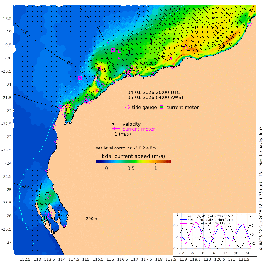 8cm/s -134T +12cm/s rms + 5cm/s -173T. NWSBAR 206m 14cm/s -138T +22cm/s rms + 10cm/s -148T. TAN100 109m 18cm/s -72T +11cm/s rms + 8cm/s -129T. PIL200 208m 32cm/s -56T +13cm/s rms + 7cm/s -137T. PIL100 105m 39cm/s -54T +12cm/s rms + 2cm/s -92T. PIL050 55m 15cm/s -134T +18cm/s rms + 4cm/s -149T. NRSNIN 61m 43cm/s -55T +6cm/s rms + 3cm/s 112T. NW Shelf M6 65m -15cm Withnell Point 18cm Denham 21cm Shark Bay (Inr Bn) 14cm Shark Bay 31cm Useless Loop 23cm Hamelin Pool -43cm Carnarvon -52cm Cape Cuvier -55cm Coral Bay -56cm Norwegian Bay -57cm Badjirrajirra -57cm Tantabiddi -54cm Point Murat -53cm Exmouth -56cm Learmonth -62cm Y Island -59cm North Muiron Island -66cm Roller -71cm Ashburton North -69cm Onslow (Beadon Creek) -72cm Thevenard Island -64cm Large Island -78cm North Sandy Island -79cm Barrow Island (Wapet Landing) -69cm Barrow Island (Tanker Mooring) -113cm Withnell Bay -77cm Trimouille Island -69cm North West Island -82cm Fortescue Road -101cm Steamboat Island -77cm Sholl Island -110cm Fairway Beacon -114cm Mawby Island -115cm Dampier (King Bay) -122cm Cape Legendre -104cm Hauy Island -126cm Port Walcott (Cape Lambert) -125cm Depuch Island -151cm Port Hedland -164cm Bedout Island -301cm Lagrange Bay