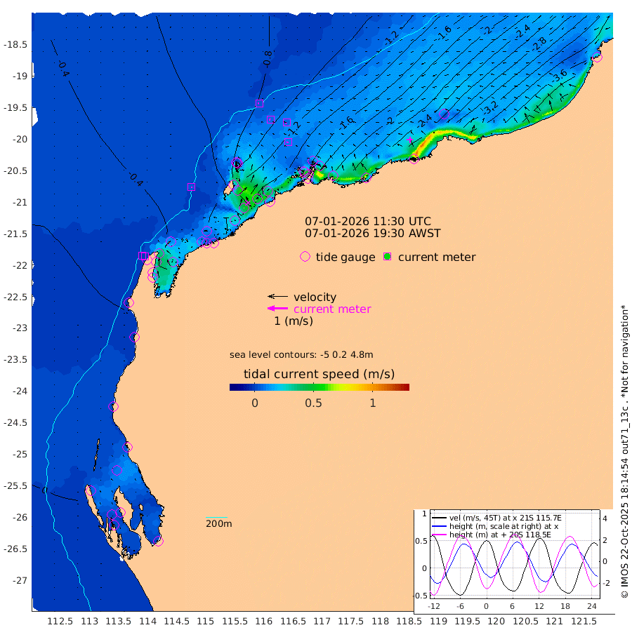 4cm/s 157T +12cm/s rms + 5cm/s -173T. NWSBAR 206m 0cm/s -70T +22cm/s rms + 10cm/s -148T. TAN100 109m 5cm/s -76T +11cm/s rms + 8cm/s -129T. PIL200 208m 7cm/s -79T +13cm/s rms + 7cm/s -137T. PIL100 105m 8cm/s -85T +12cm/s rms + 2cm/s -92T. PIL050 55m 0cm/s -1T +18cm/s rms + 4cm/s -149T. NRSNIN 61m 7cm/s -147T +6cm/s rms + 3cm/s 112T. NW Shelf M6 65m -7cm Withnell Point 3cm Denham 0cm Shark Bay (Inr Bn) 5cm Shark Bay 9cm Useless Loop 7cm Hamelin Pool -22cm Carnarvon -16cm Cape Cuvier -19cm Coral Bay -23cm Norwegian Bay -73cm Badjirrajirra -28cm Tantabiddi -49cm Point Murat -62cm Exmouth -83cm Learmonth -59cm Y Island -41cm North Muiron Island -52cm Roller -59cm Ashburton North -66cm Onslow (Beadon Creek) -61cm Thevenard Island -122cm Large Island -125cm North Sandy Island -95cm Barrow Island (Wapet Landing) -122cm Barrow Island (Tanker Mooring) -141cm Withnell Bay -91cm Trimouille Island -74cm North West Island -144cm Fortescue Road -128cm Steamboat Island -138cm Sholl Island -138cm Fairway Beacon -142cm Mawby Island -141cm Dampier (King Bay) -141cm Cape Legendre -155cm Hauy Island -180cm Port Walcott (Cape Lambert) -192cm Depuch Island -229cm Port Hedland -213cm Bedout Island -312cm Lagrange Bay