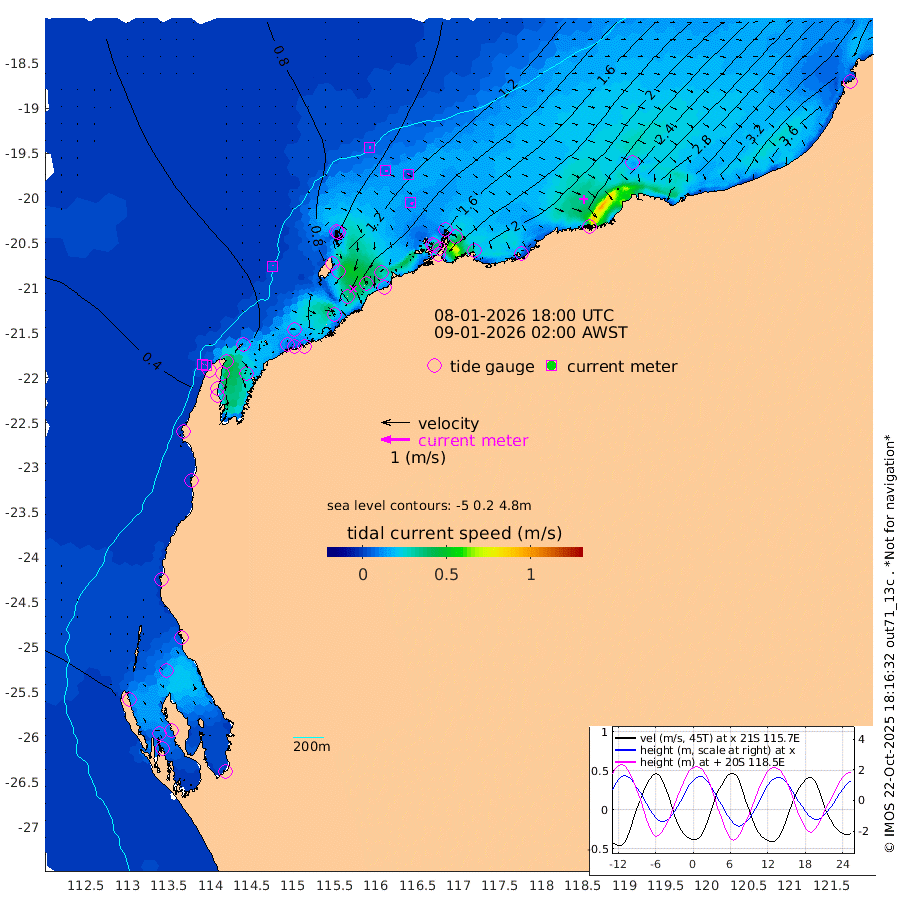 4cm/s 12T +12cm/s rms + 5cm/s -173T. NWSBAR 206m 2cm/s 50T +22cm/s rms + 10cm/s -148T. TAN100 109m 6cm/s 101T +11cm/s rms + 8cm/s -129T. PIL200 208m 7cm/s 111T +13cm/s rms + 7cm/s -137T. PIL100 105m 8cm/s 106T +12cm/s rms + 2cm/s -92T. PIL050 55m 2cm/s 51T +18cm/s rms + 4cm/s -149T. NRSNIN 61m 4cm/s 49T +6cm/s rms + 3cm/s 112T. NW Shelf M6 65m 21cm Withnell Point 13cm Denham 13cm Shark Bay (Inr Bn) 18cm Shark Bay 7cm Useless Loop -8cm Hamelin Pool 37cm Carnarvon 31cm Cape Cuvier 35cm Coral Bay 35cm Norwegian Bay 83cm Badjirrajirra 43cm Tantabiddi 62cm Point Murat 74cm Exmouth 83cm Learmonth 74cm Y Island 55cm North Muiron Island 65cm Roller 71cm Ashburton North 77cm Onslow (Beadon Creek) 75cm Thevenard Island 124cm Large Island 131cm North Sandy Island 103cm Barrow Island (Wapet Landing) 129cm Barrow Island (Tanker Mooring) 146cm Withnell Bay 95cm Trimouille Island 83cm North West Island 142cm Fortescue Road 136cm Steamboat Island 144cm Sholl Island 143cm Fairway Beacon 144cm Mawby Island 147cm Dampier (King Bay) 141cm Cape Legendre 155cm Hauy Island 181cm Port Walcott (Cape Lambert) 188cm Depuch Island 225cm Port Hedland 230cm Bedout Island 291cm Lagrange Bay