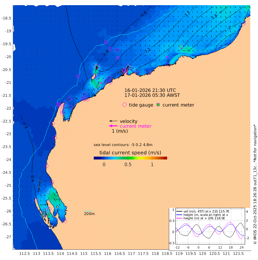 4cm/s 62T +12cm/s rms + 5cm/s -173T. NWSBAR 206m 2cm/s -147T +22cm/s rms + 10cm/s -148T. TAN100 109m 4cm/s 100T +11cm/s rms + 8cm/s -129T. PIL200 208m 6cm/s 149T +13cm/s rms + 7cm/s -137T. PIL100 105m 6cm/s 170T +12cm/s rms + 2cm/s -92T. PIL050 55m 3cm/s -152T +18cm/s rms + 4cm/s -149T. NRSNIN 61m 6cm/s 163T +6cm/s rms + 3cm/s 112T. NW Shelf M6 65m -45cm Withnell Point -41cm Denham -37cm Shark Bay (Inr Bn) -42cm Shark Bay -30cm Useless Loop 16cm Hamelin Pool -58cm Carnarvon -45cm Cape Cuvier -46cm Coral Bay -45cm Norwegian Bay -77cm Badjirrajirra -49cm Tantabiddi -64cm Point Murat -71cm Exmouth -77cm Learmonth -65cm Y Island -56cm North Muiron Island -59cm Roller -66cm Ashburton North -70cm Onslow (Beadon Creek) -68cm Thevenard Island -128cm Large Island -110cm North Sandy Island -86cm Barrow Island (Wapet Landing) -109cm Barrow Island (Tanker Mooring) -104cm Withnell Bay -87cm Trimouille Island -73cm North West Island -134cm Fortescue Road -103cm Steamboat Island -89cm Sholl Island -103cm Fairway Beacon -101cm Mawby Island -106cm Dampier (King Bay) -104cm Cape Legendre -111cm Hauy Island -126cm Port Walcott (Cape Lambert) -144cm Depuch Island -146cm Port Hedland -133cm Bedout Island -224cm Lagrange Bay